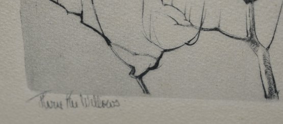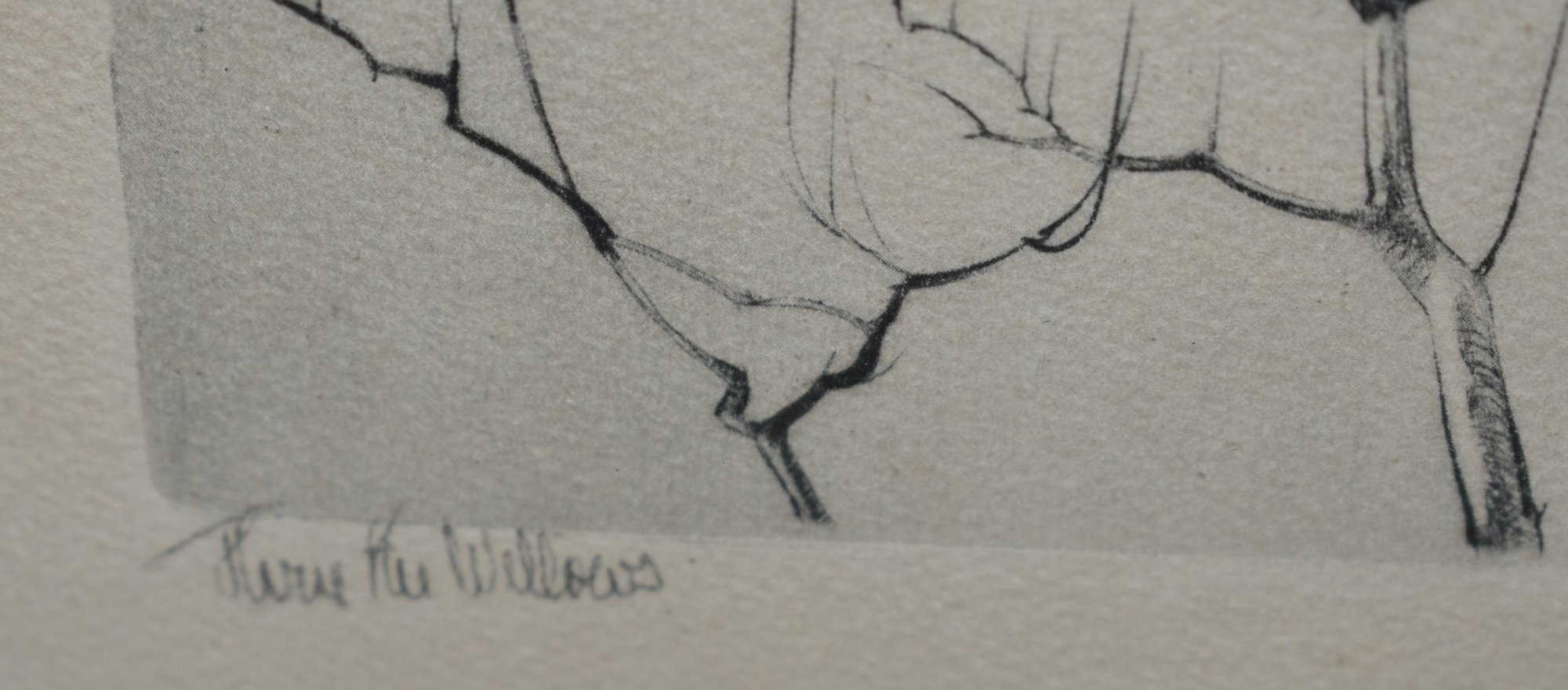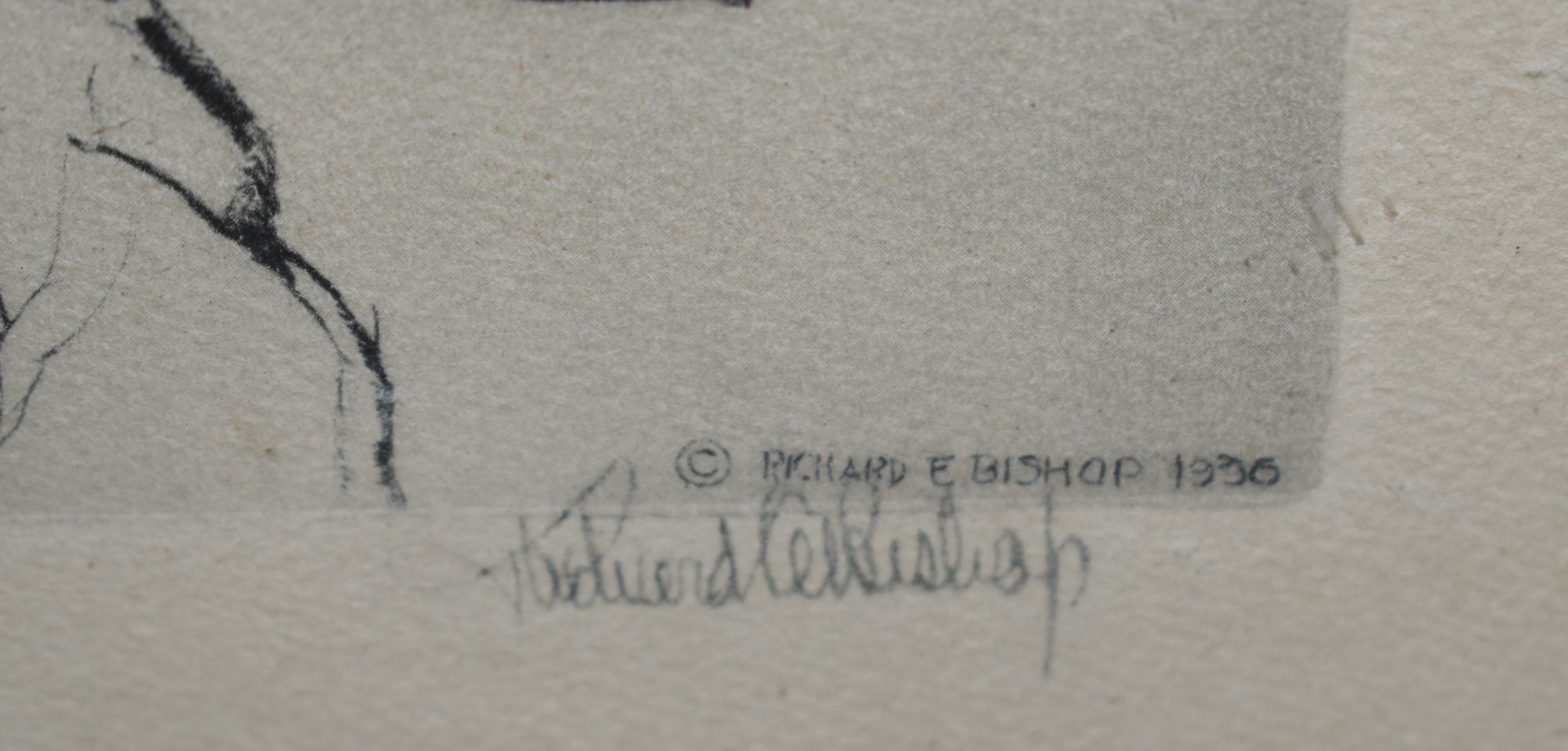 DUCKS IN FLIGHT TITLED " THRU THE WILLOWS" - SIGNED RICHARD E. BISHOP LOWER RIGHT - REPRO UPPER LEFT - PAPER LABEL W/ TITLED & INFO ON BACK - 12" X 15" - TONING & WEAR