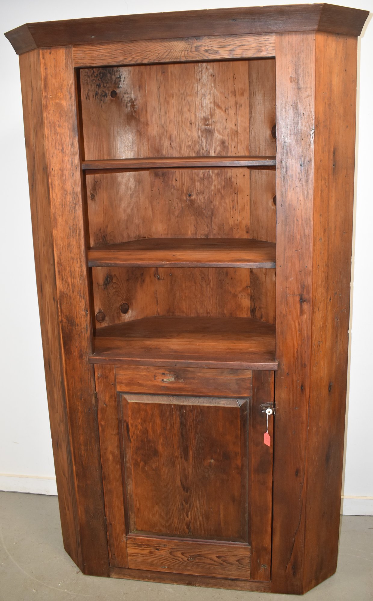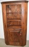 PRIMATIVE N.E. PINE CORNER CUPBOARD W/ OPEN TOP W/ 2 SHELF - RAISED PANEL CUPBOARD BELOW - DARK NATURAL FINSIH - 81" T X 48" W X 21" D - REFINISHED, REPAIRS & REPLACEMENTS