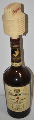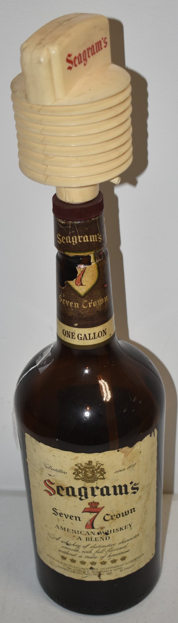VINTAGE SEAGRAMS 7 BAR DISPLAY 24 1/2" GLASS SEAGRAMS BOTTLE W/ POURER - WEAR, LOSSES TO LABELS & IMPERFECTIONS
