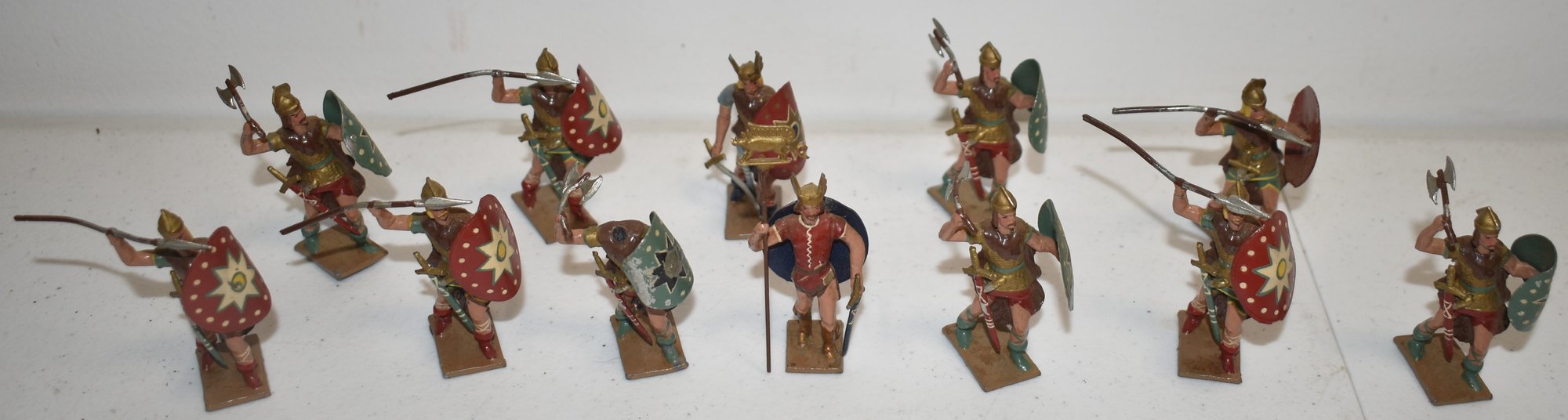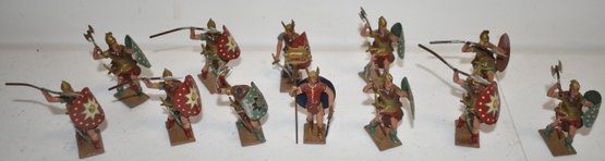 SET (12) FRENCH LEAD SOLDIER - WARRIORS W/ RED SHIELDS MARKED C.B.G. MADE IN FRANCE - 2 1/2" T - WEAR, SOME BREAKS - (1) MISSING HEAD