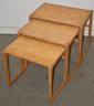 SET (3) BLONDE MAPLE NESTING TABLES - HAYWOOD WAKEFIELD? 19 1/2" - 18" & 16 1/2" T - 22 1/2" - 20 1/2" & 18 1/2" W - WEAR, SPOTTING/STAINS & IMPERFECTIONS