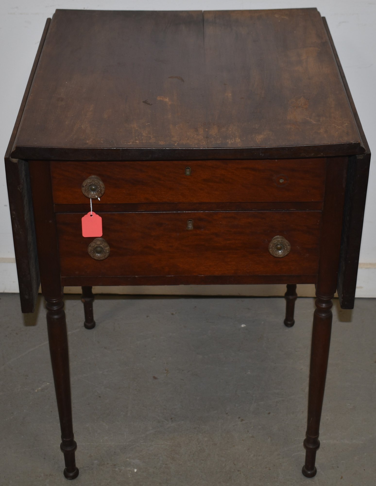 19TH CENT SHERATON MAHOGANY 2 DRAWER DROPLEAF STAND ON DELICATLEY TURNED LEGS - 29 1/2" T X 22 1/2" D X 43 1/2" W X (OPEN) - WEAR, FADING, STAINS TO TOP, MISSING 1 GLASS DRAWER PULL & IMPERFECTIONS