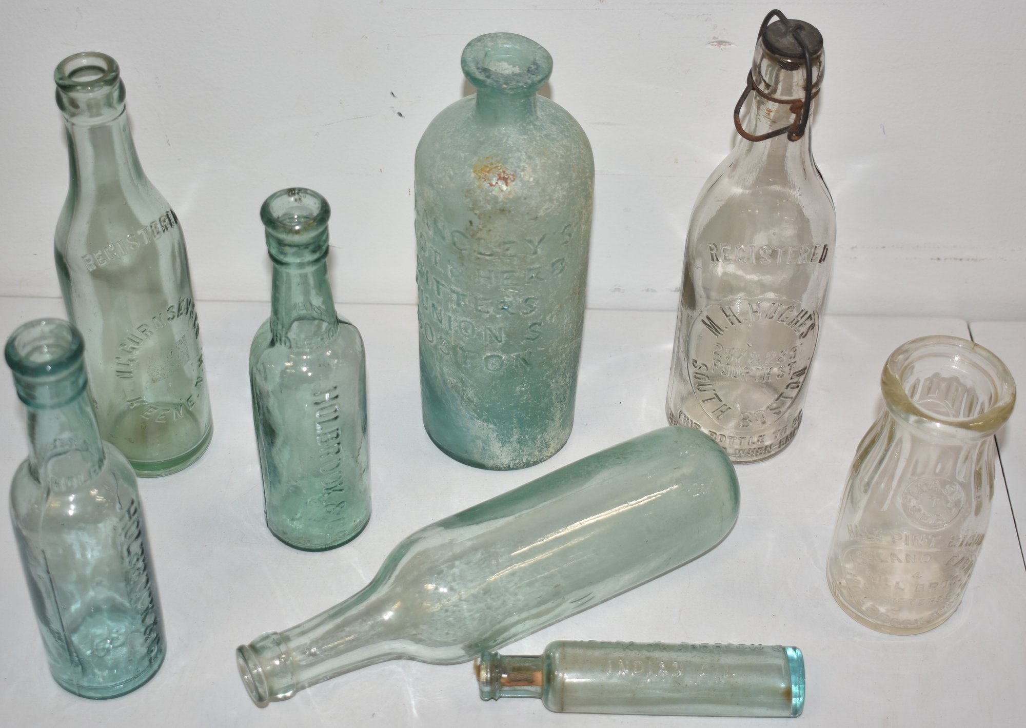 ASHLAND FARMS MILK BOTTLE, (2) HOLBROOK KEENE NH, MH HUGHES & TORPEDO BOTTLE - WEAR