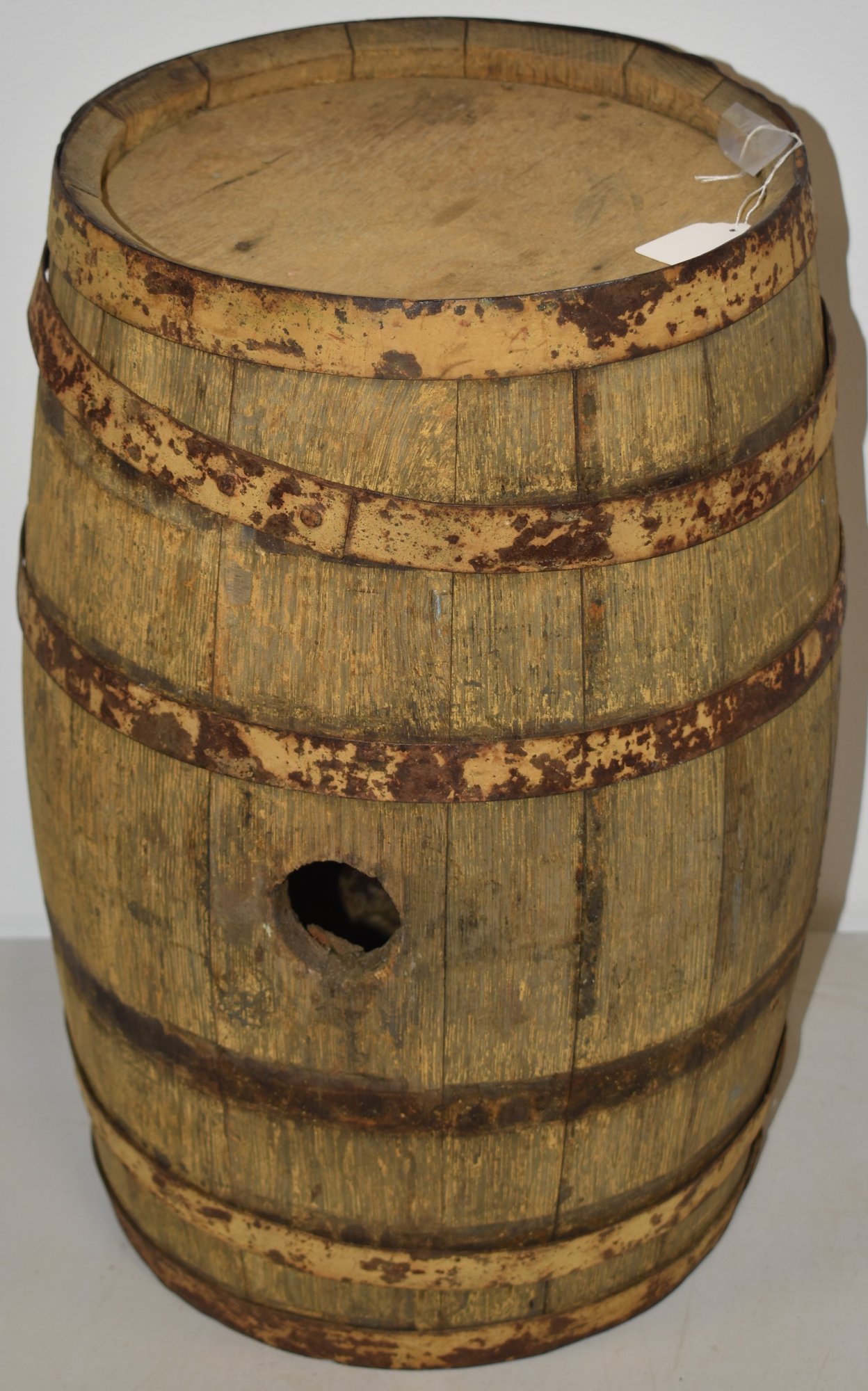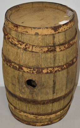 LATE 19TH EARLY 20TH CENT SM. PAINTED BARREL KEG -17" L X 12" DIA - IN OLD YELLOW PAINT - MISSING ONE METAL BAND - WEAR