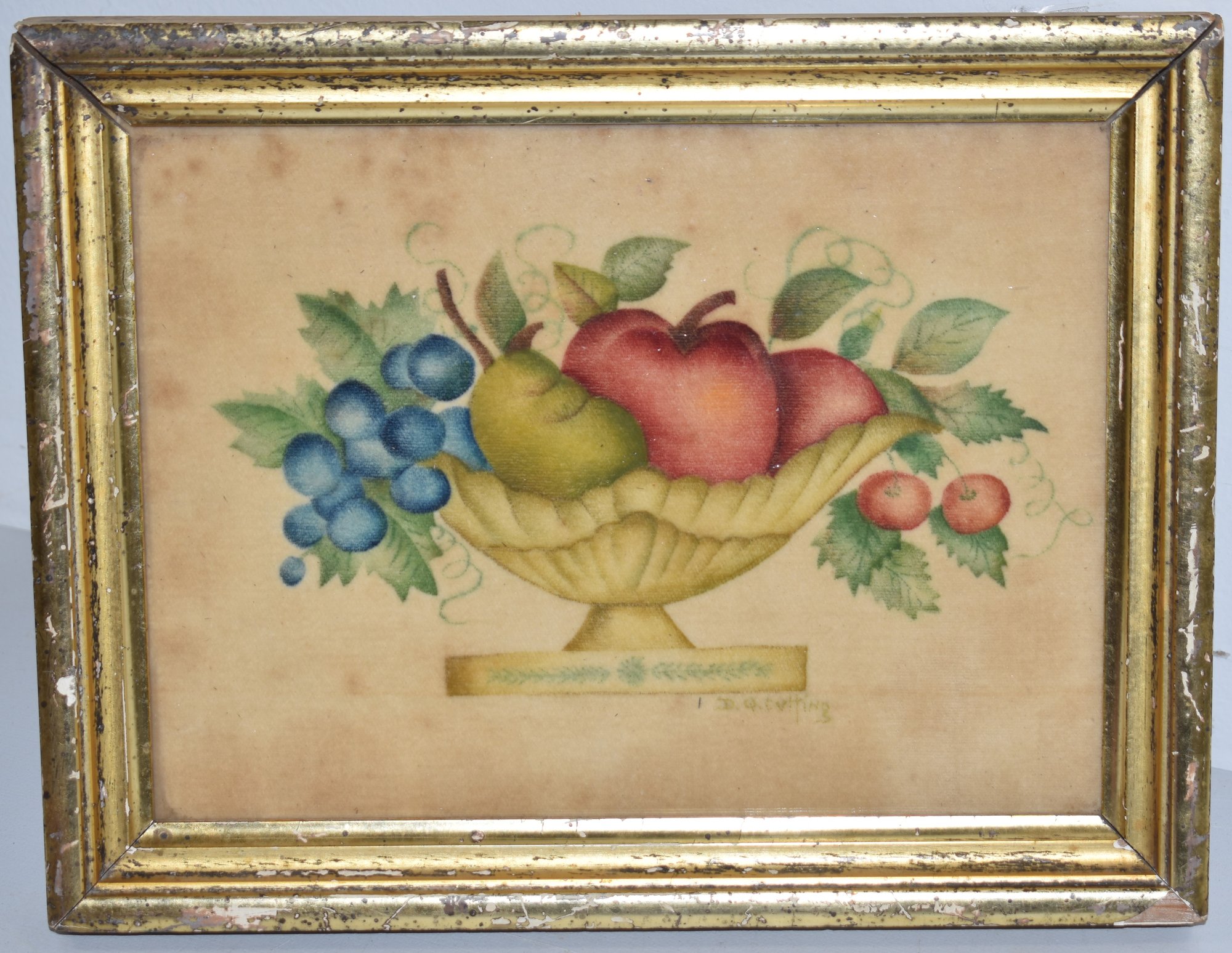 URN OF FRUIT THEORUM PAINTING SIGNED E.Q. CUTTING - IN LEMON GOLD FRAME - 6 3/4" X 9 1/4" SIGHT - TONING, SPOTTING & WEAR