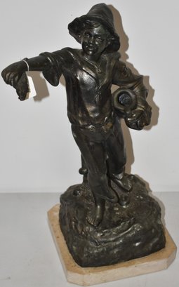 19" SPELTER METAL FIGURE OF YOUNG BOY HOLDING FISH & FISHING NET ON WHITE MARBLE BASE - WEAR