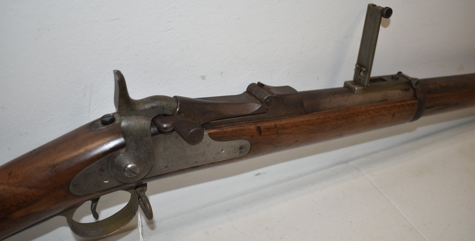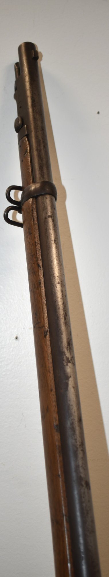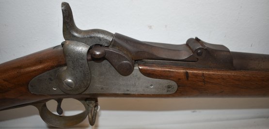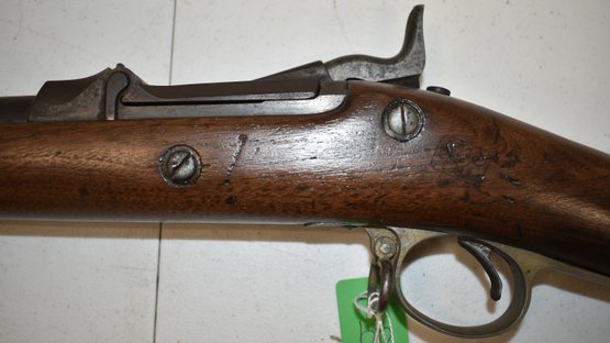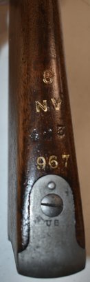 SERIAL # 538307 - SPRINGFIELD US MODEL 1888 TRAPDOOR RIFLE W/ RAMROD BAYONET W/ WALNUT STOCK INSCRIBED 13 N.Y. ON SIDE OF STOCK - 8 N.Y. 425 967 ON TOP OF STOCK - OLD REPAIR TO STOCK - U.S. SPRINGFIELD ENGRAVED ON LOCK PLATE - 52" L - WEAR & IMPERFECTIONS