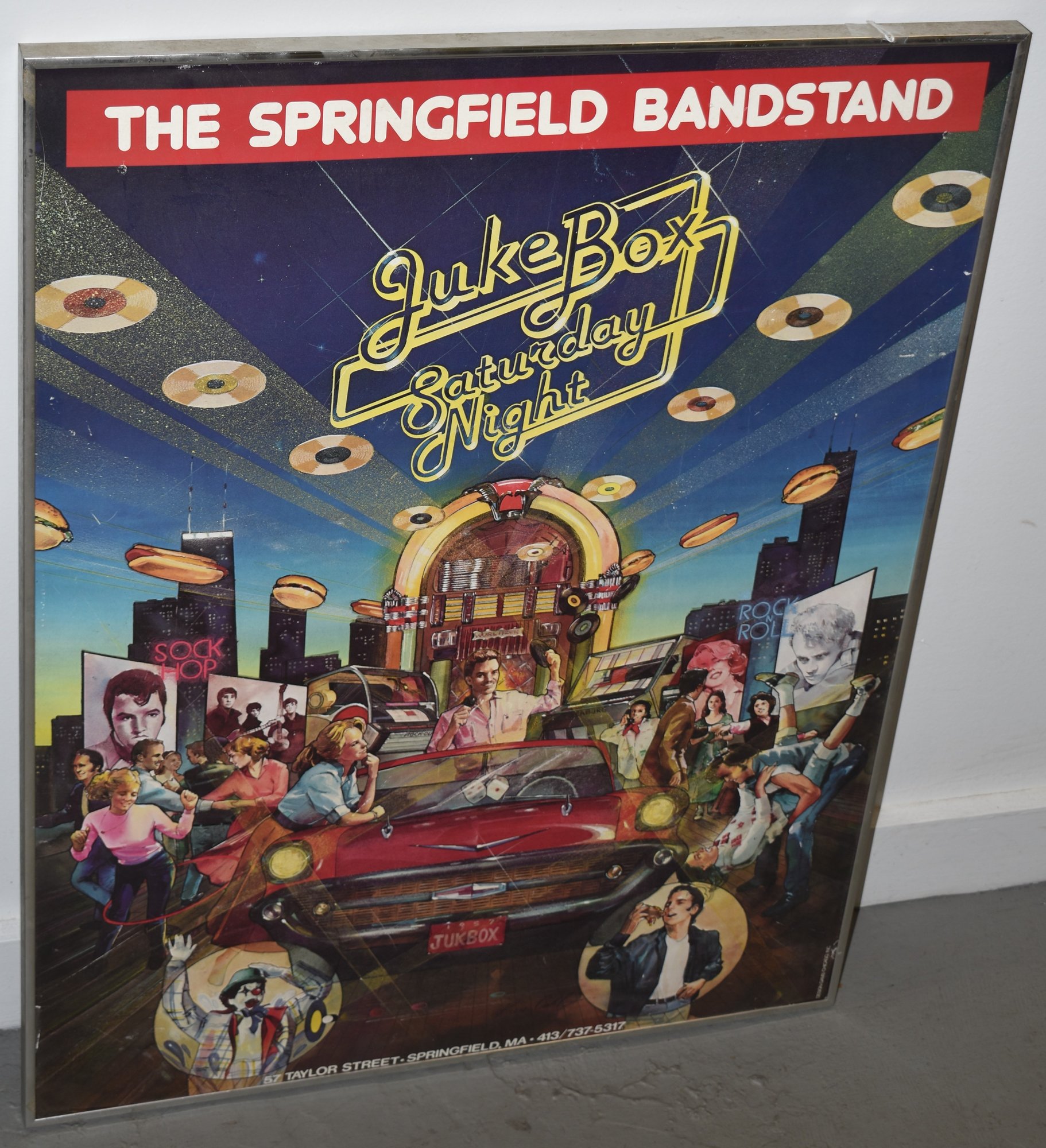 VINTAGE 1980'S SPRINGFIELD BANDSTAND JUKE BOX SATURDAY NIGHTS WURLITZER POSTER - 57 TAYLOR ST. SPRINGFIELD MA. 30 1/4" X 23 1/4" WITH THIN METAL FRAME - WEAR