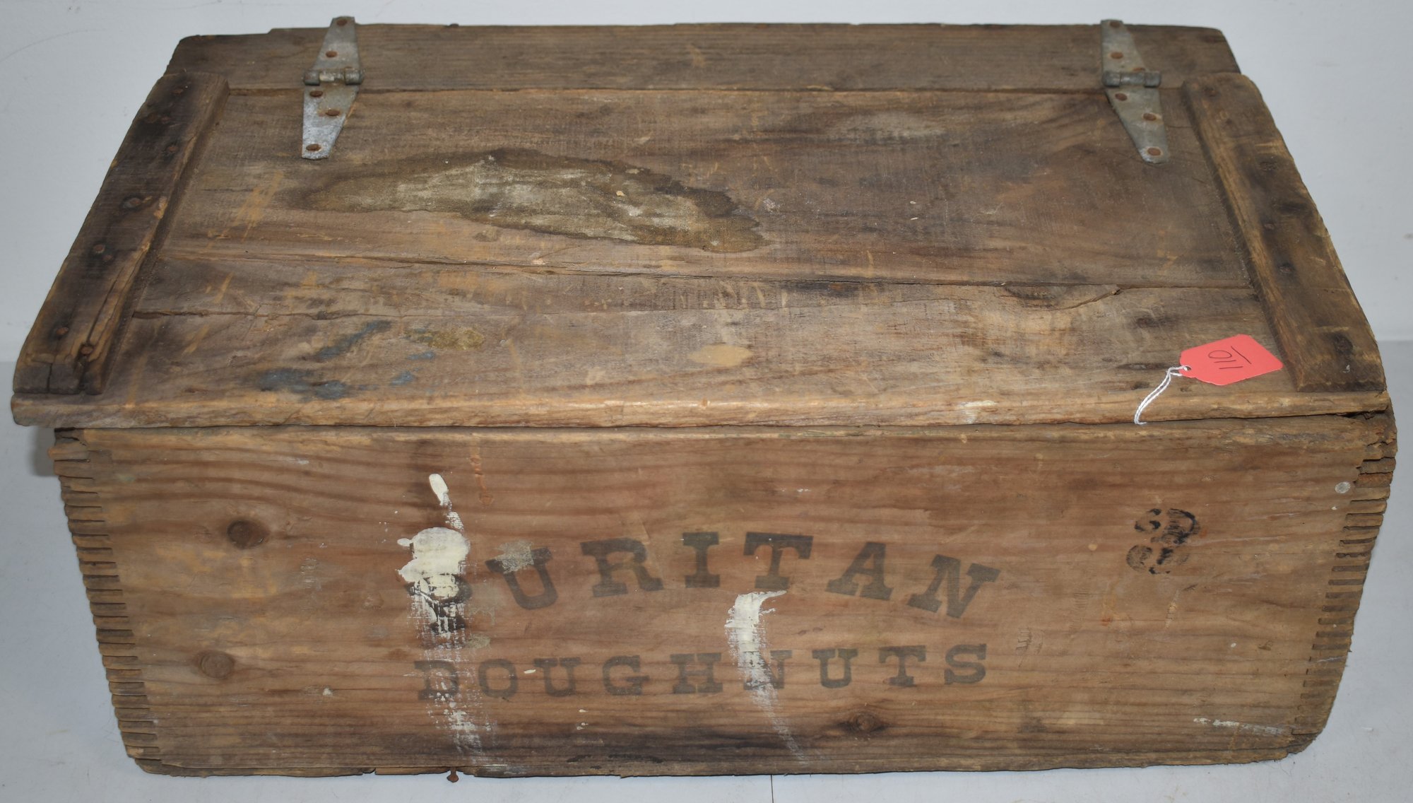 WOODEN CRATE W/ LIFT TOP STENCILED PURITAN DOUGHNUTS ON FRONT - WEAR, MISSING BOARD ON BASE & IMPERFECTIONS