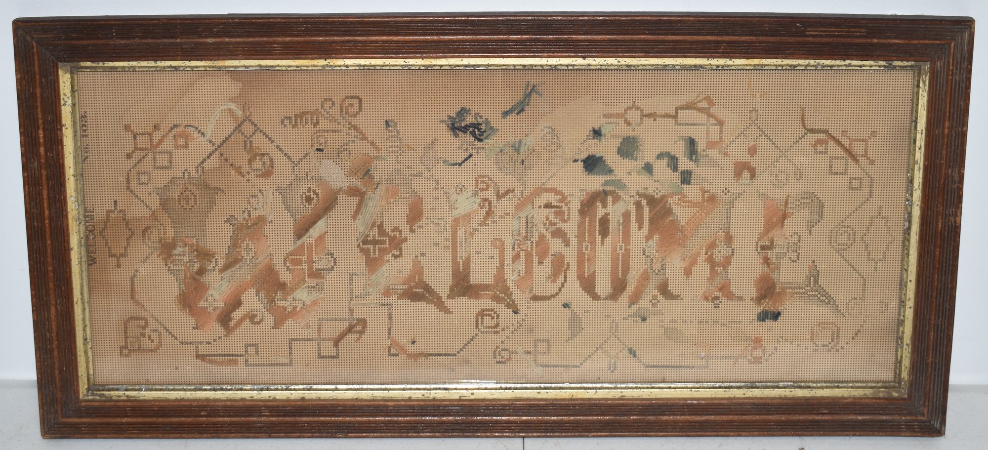 WELCOME MOTTON IN WALNUT FRAME - 20 3/4" X 8 1/2" SIGHT - WEAR, LOSSES, STAINS & IMPERFECTIONS