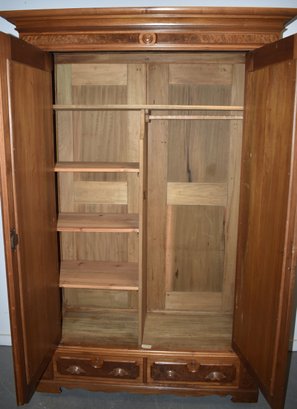 VICTORIAN WALNUT 2 DOOR ARMOIRE W/ BURL WALNUT RECESSED PANELED 2 DOORS OVER 2 LOWER DRAWERS W/ CARVED PULLS - 88" T X 51 1/2" W X 19" D - WEAR & IMPERFECTIONS