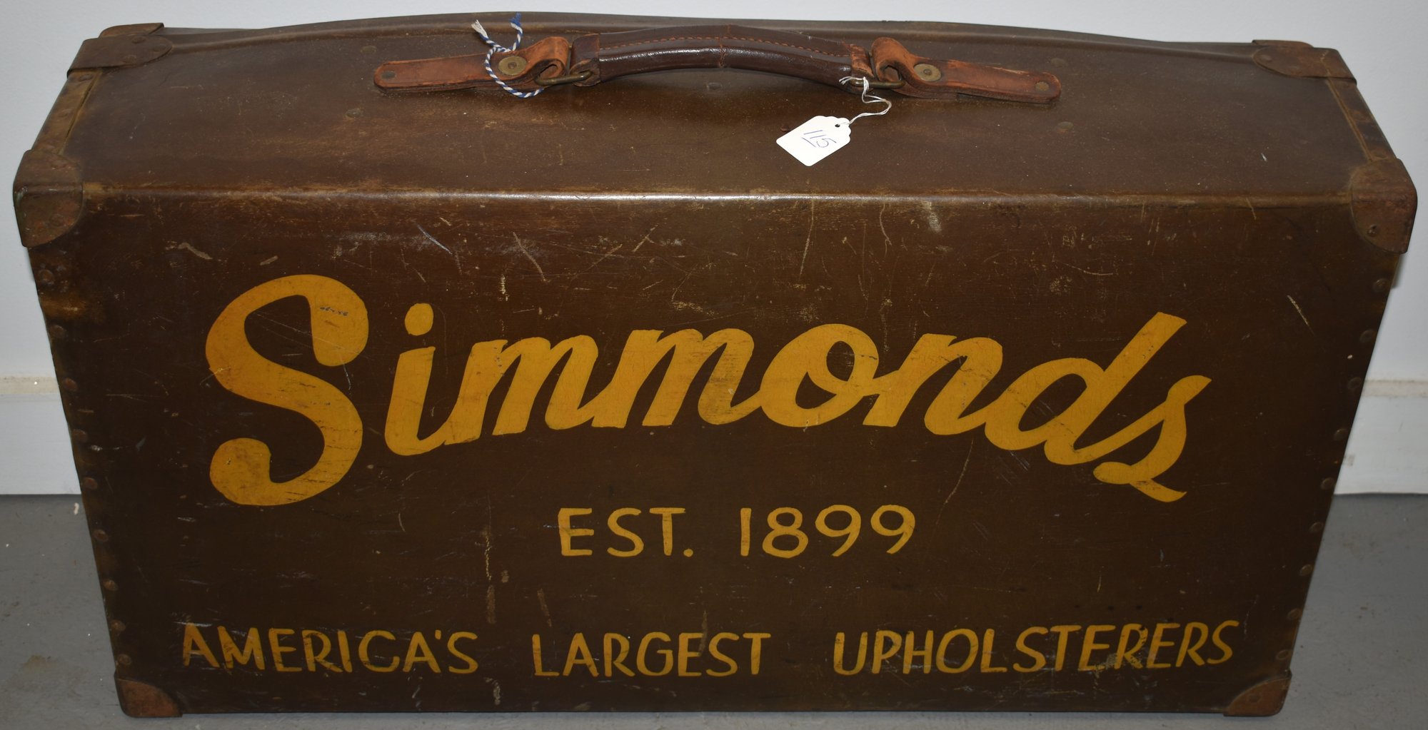 EARLY 20TH CENT SUITCASE - SIMONDS AMERICAS LARGEST UPHOLSTERY EST 1899 - 29 1/2" L X 7 1/2" T X 16" W - WEAR