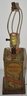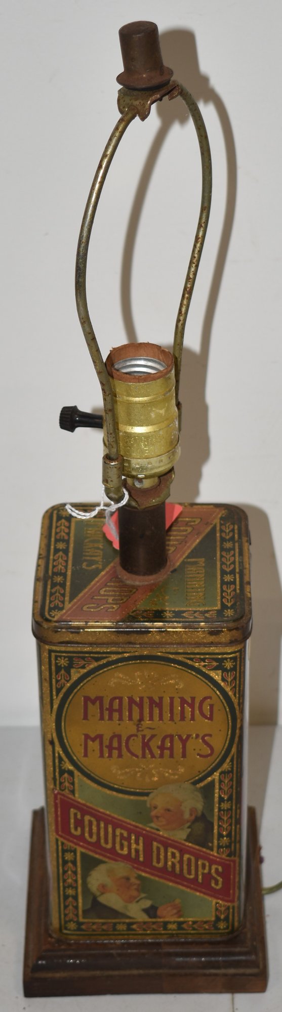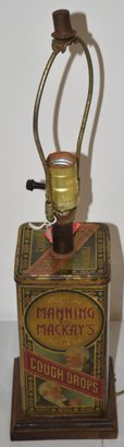 VINTAGE MANNING & MACKAYS ADVERTISING TIN, FITTED INTO TABLE LAMP - TIN 8" T X 3 3/4" SQ. - 20" T - TOTAL - NO SHADE - WEAR & IMPERFECTIONS