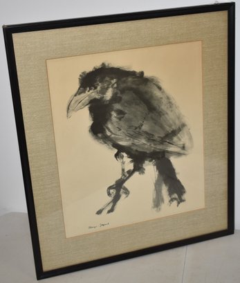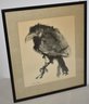 MID 20TH CENT PRINT OF A BLACKBIRD PERCHED ON A BRANCH - SIGNED LWOER LEFT - UNCLEAR - MATTED & FRAMED - 18 1/2" X 15 1/2" - TONING