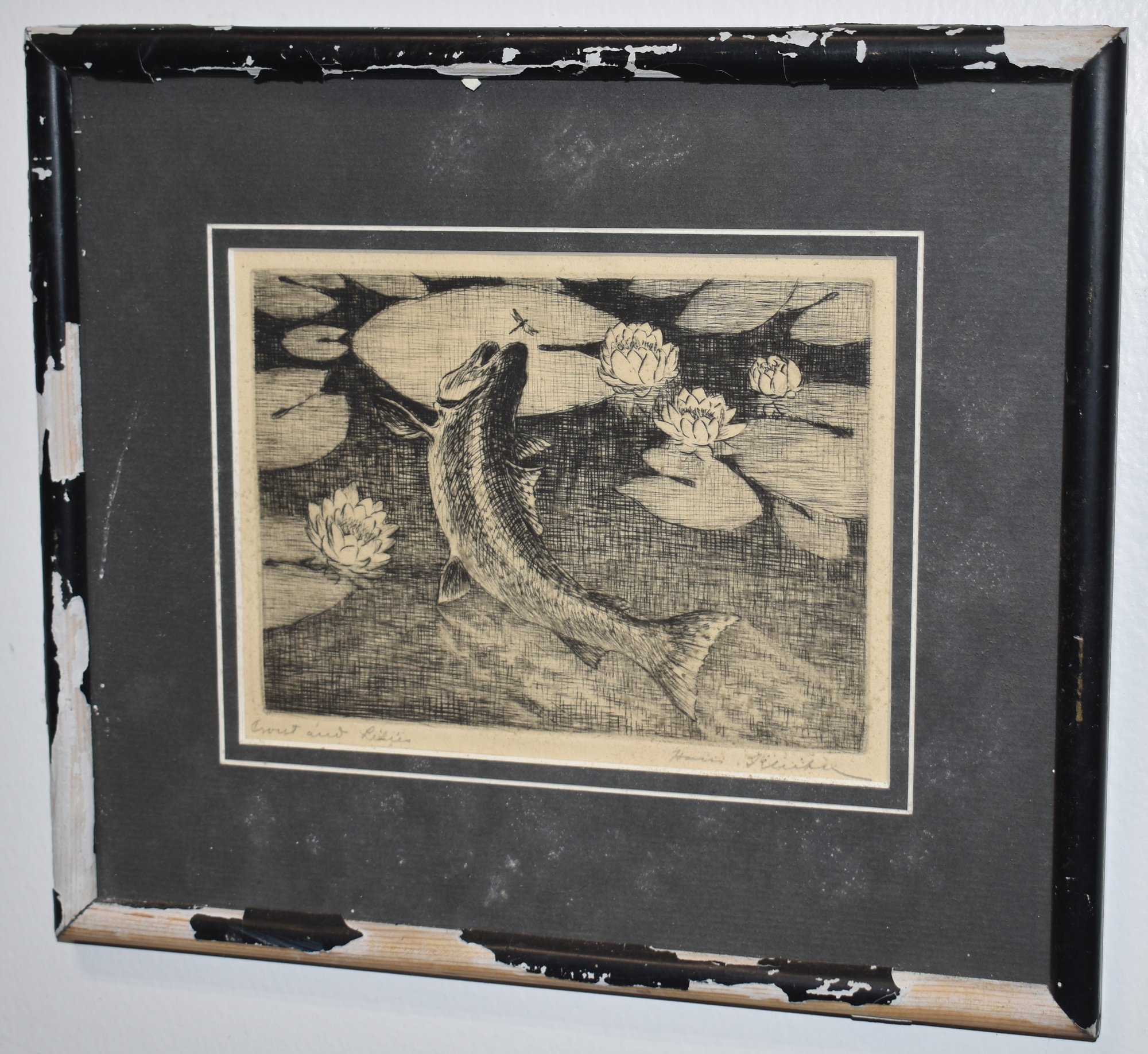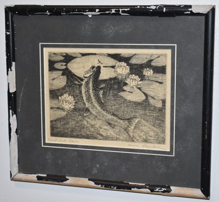 TROUT & LILLIES - SIGNED LOWER RIGHT - 4 1/2" X 5 3/4" SIGHT - MATTED & FRAMED - TONING & WEAR