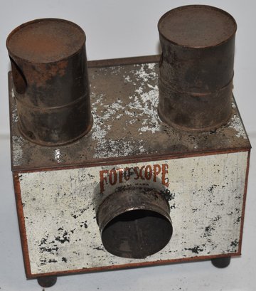 FOTOSCOPE TIN POSTCARD PROJECTOR - COMPLETE W/ TIN OIL LAMPS - 10 3/4" T X 8 3/4" W X 6 1/4" D - WEAR & LOSSES TO PAINT