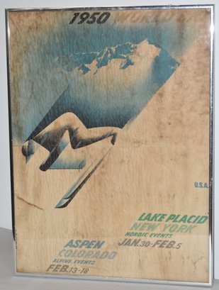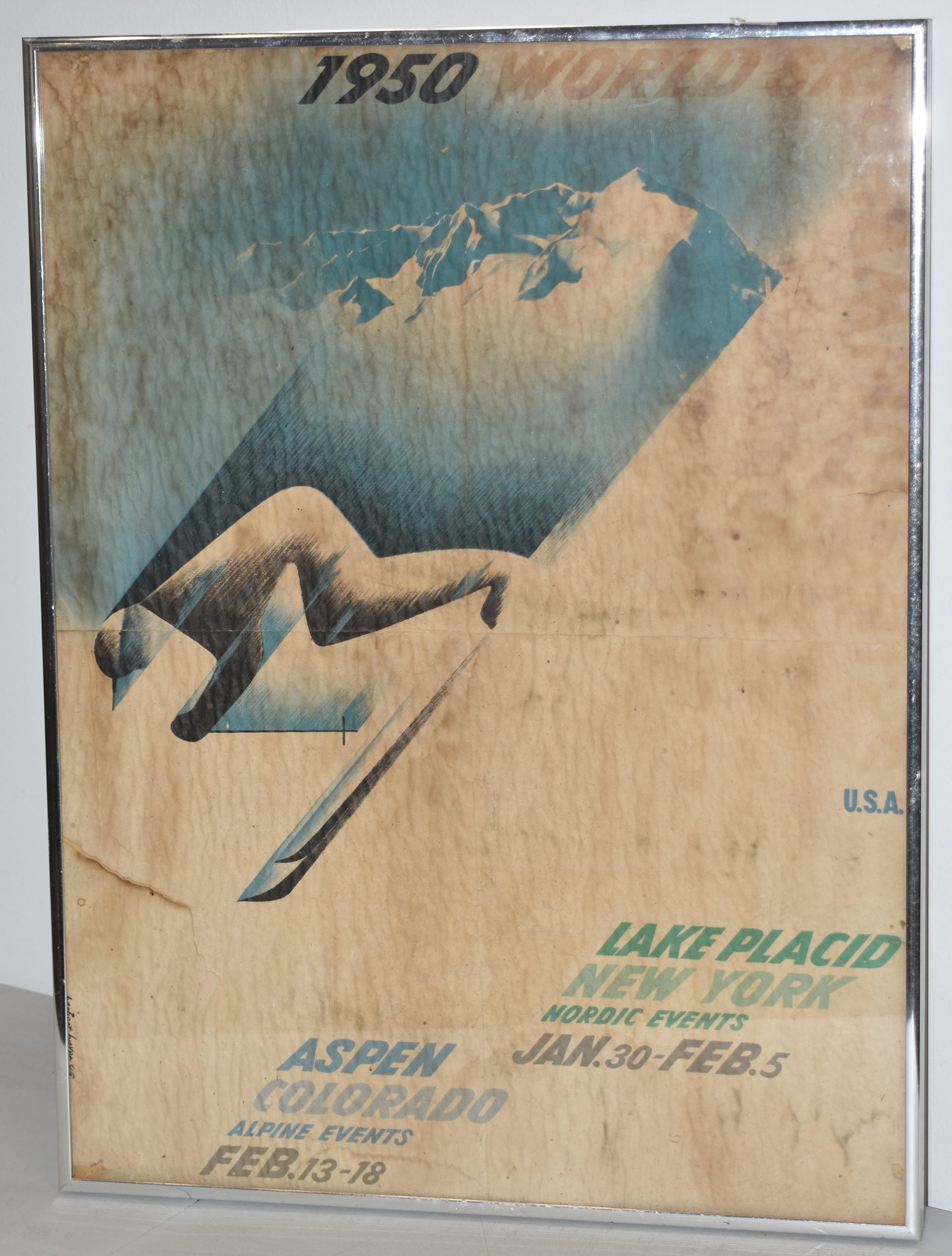 1950'S WORLD SKI POSTER ASPEN COLO. LAKE PLACID - 21 1/4" X 15 3/4" - TONING, SM. TEARS, STAINS & IMPERFECTIONS