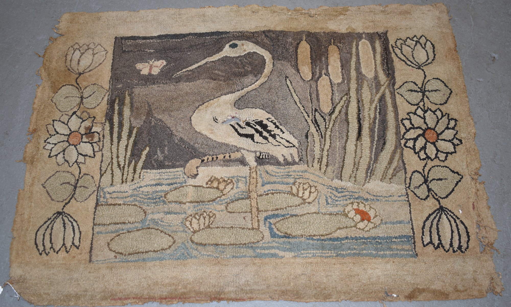LATE 19TH EARLY 20TH CENT FIGURAL HOOKED RUG W/ CRANE STANDING IN RUSH & LILY PADS - 42" X 30" - EDGE LOSSES, HOLES, SOILING & IMPERFECTIONS