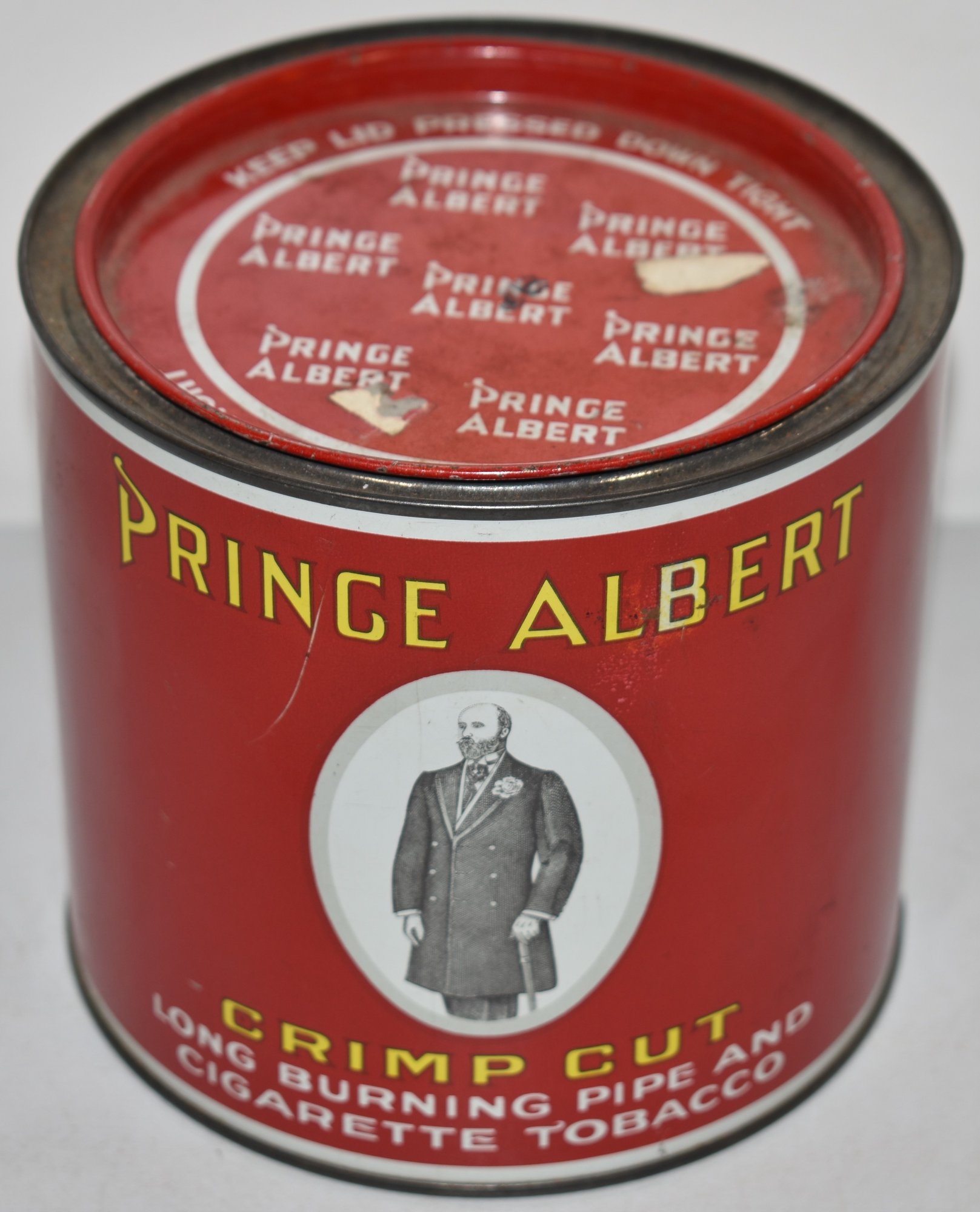ROUND PRINCE ALBERT CRIMP CUT TOBACCO TIN - 5 1/4" DIA X 5" T - WEAR & IMPERFECTIONS