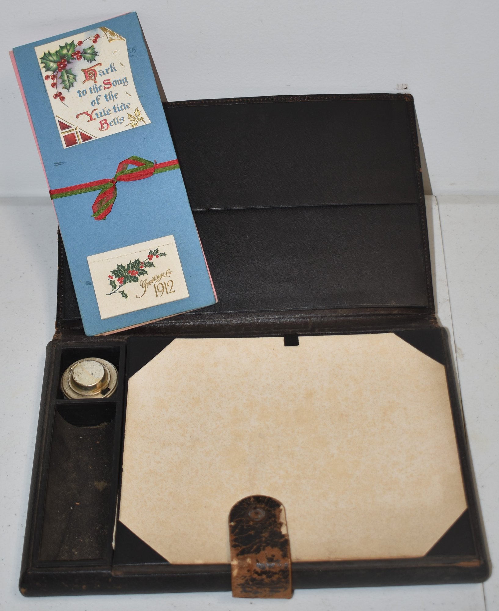LATE 19TH EARLY 20TH CENT LEATHER TOP LAP DESK W/ MIXED EPHEMERA & PHOTOGRAPHS - WEAR