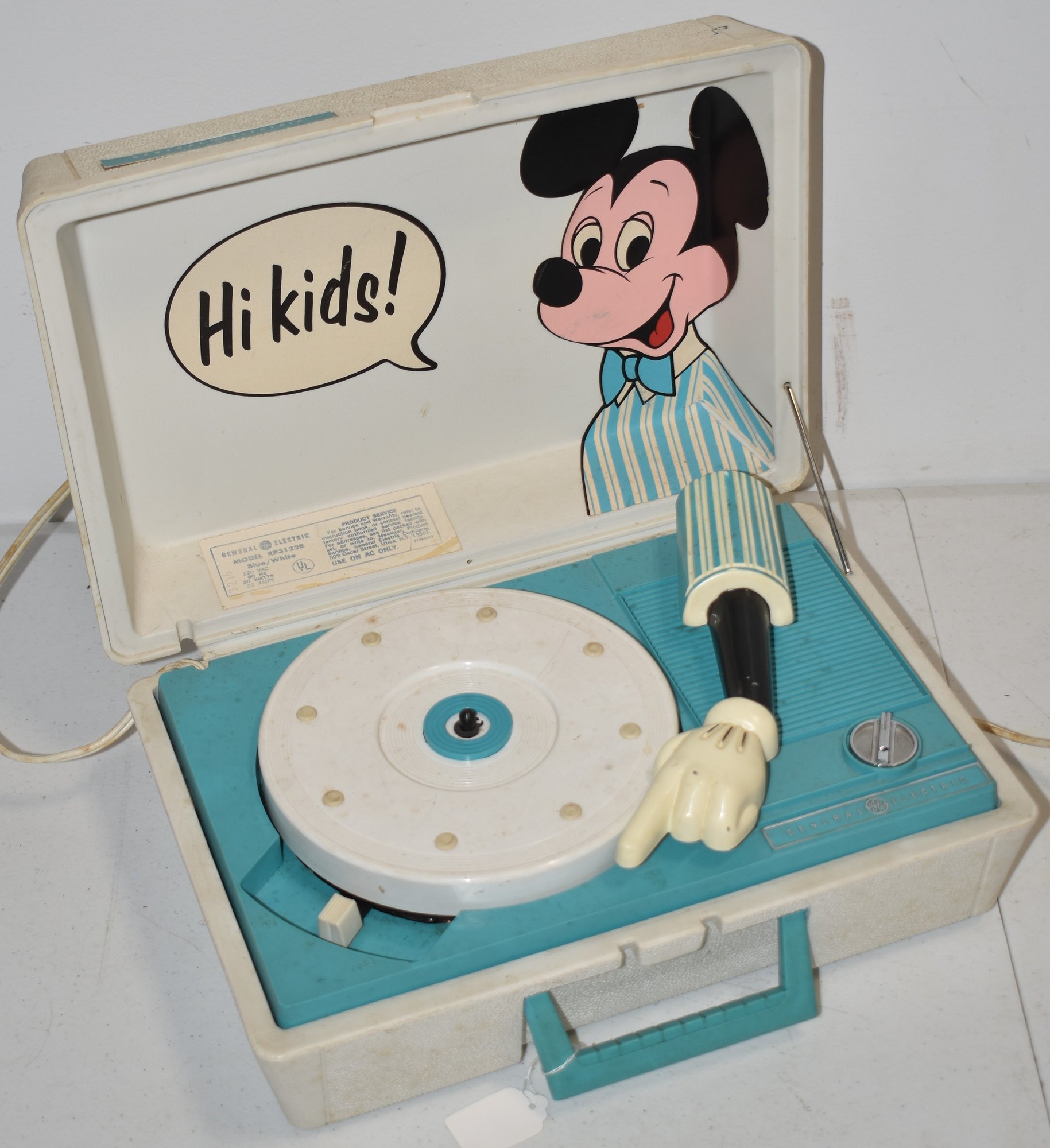 GENERAL ELECTRIC MICKEY MOUSE RECORD PLAYER - WALT DISNEY PRODUCTIONS MODEL # RB31228 - WEAR, MISSING SNAP FOR CLOSURE
