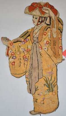 VINTAGE EARLY 20TH CENT NEEDLEWORK OF AN ASIAN LADY IN ROBE - 20 1/2" T - WEAR & IMPERFECTIONS