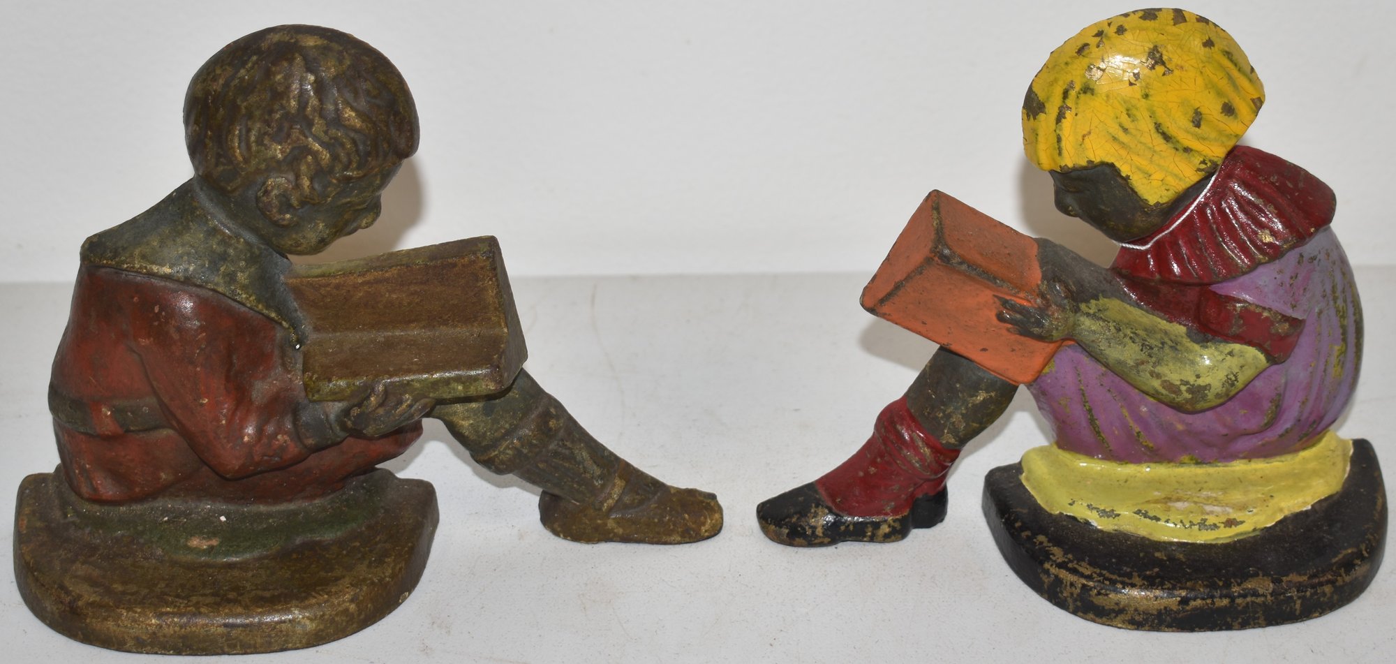 PR. BOY & GIRL PAINTED CAST IRON BOOKENDS - 5 1/4" T X 5 3/4" L - WEAR & LOSSES TO PAINT & IMPERFECTIONS