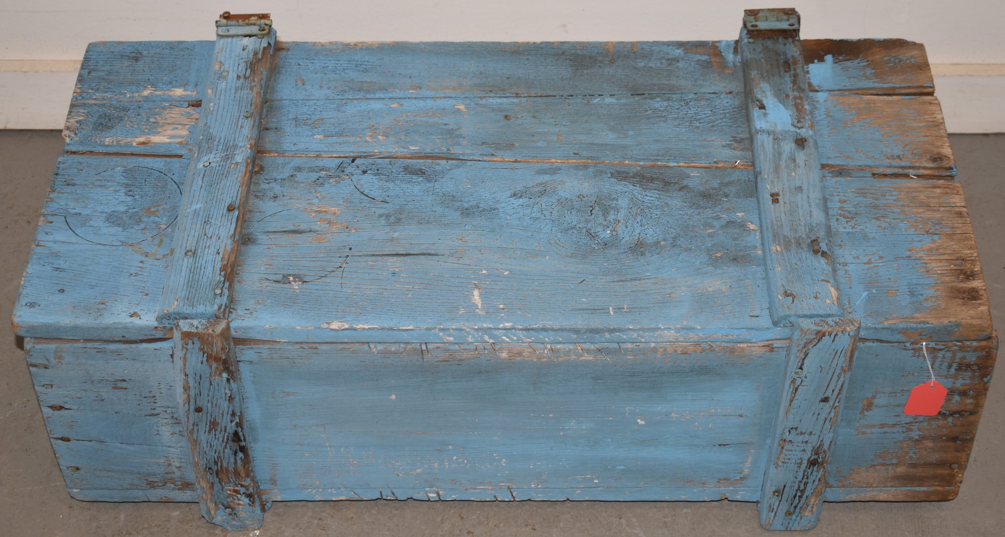 EARLY 20TH CENT PAINTED WOODEN CRATE IN OLD BLUE - 33 1/2" L X 11 1/4" T X 17" W - WEAR, LOSSES TO PAINT - LID DETATCHED & IMPERFECTIONS