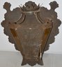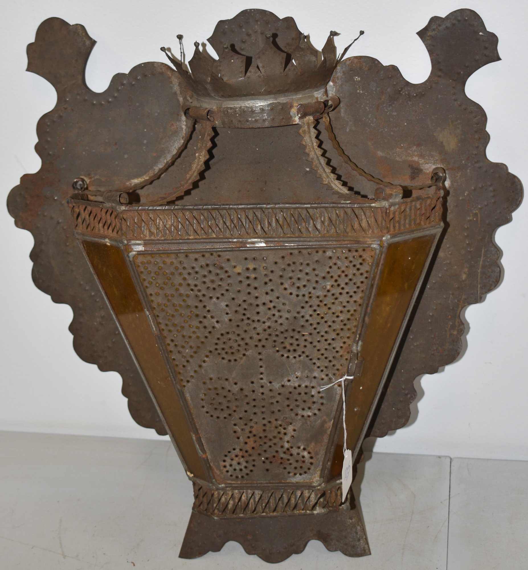 VINTAGE 20TH CENT PIERCED TIN WALL BOX W/ COLRED GLASS PANELS - 18" L X 17" W X 4" D - WEAR, OXIDATION & IMPERFECTIONS