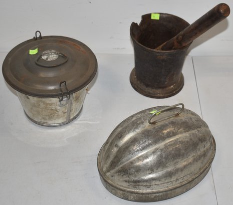 (2) TIN MOLDS & CAST IRON MORTART & PESTLE - DAMAGE TO MORTAR - WEAR & IMPERFECTIONS
