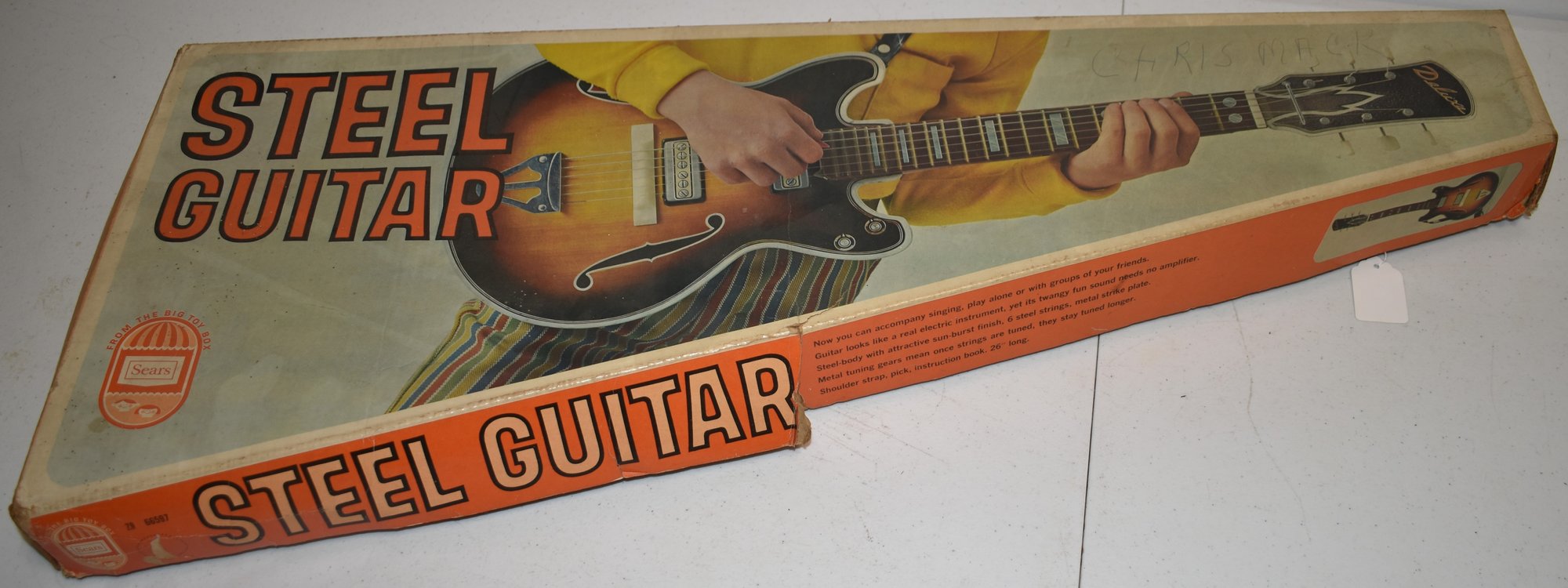 DELUXE STEEL GUITAR - FROM THE BIG TOY BOX - SEARS - 27" IN ORIGINAL BOX - WEAR, TEAR IN SIDE OF BOX & NAME WRITTEN ON TOP BOX - IMPERFECTIONS