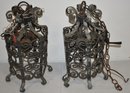 PR. VINTAGE BLACK WROUGHT IRON HANGING LAMPS - 18" W/ IRON CHAIN FOR HANGING - 1 PANEL DETATCHED - 1 PANEL MISSING - WEAR & IMPERFECTIONS