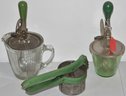 3 PC'S VINTAGE MID 20TH CENT GREEN HANDLED KITCEHNWARE - MASHER & (2) EGG BEATERS - MIXERS - WEAR & IMPERFECTIONS
