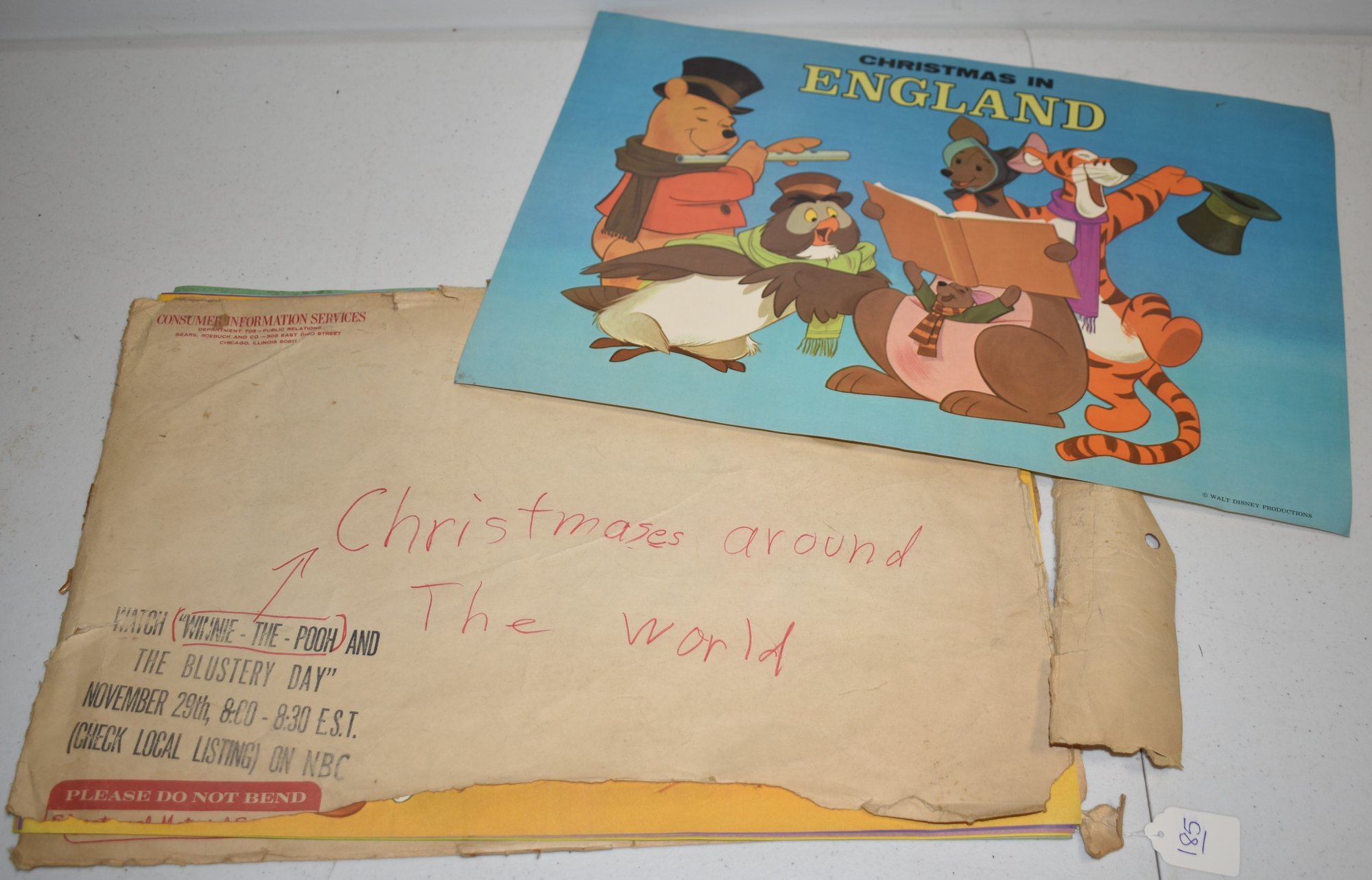VINTAGE WALT DISNEY CHRISTMAS AROUND THE WORLD POSTERS - WINNIE THE POOH & THE BLUSTERY DAY IN ORIGINAL PACKAGING ENVELOPE 12" X 18" LOSSES & DAMGE TO ENVELOPE (12 PC) - WEAR