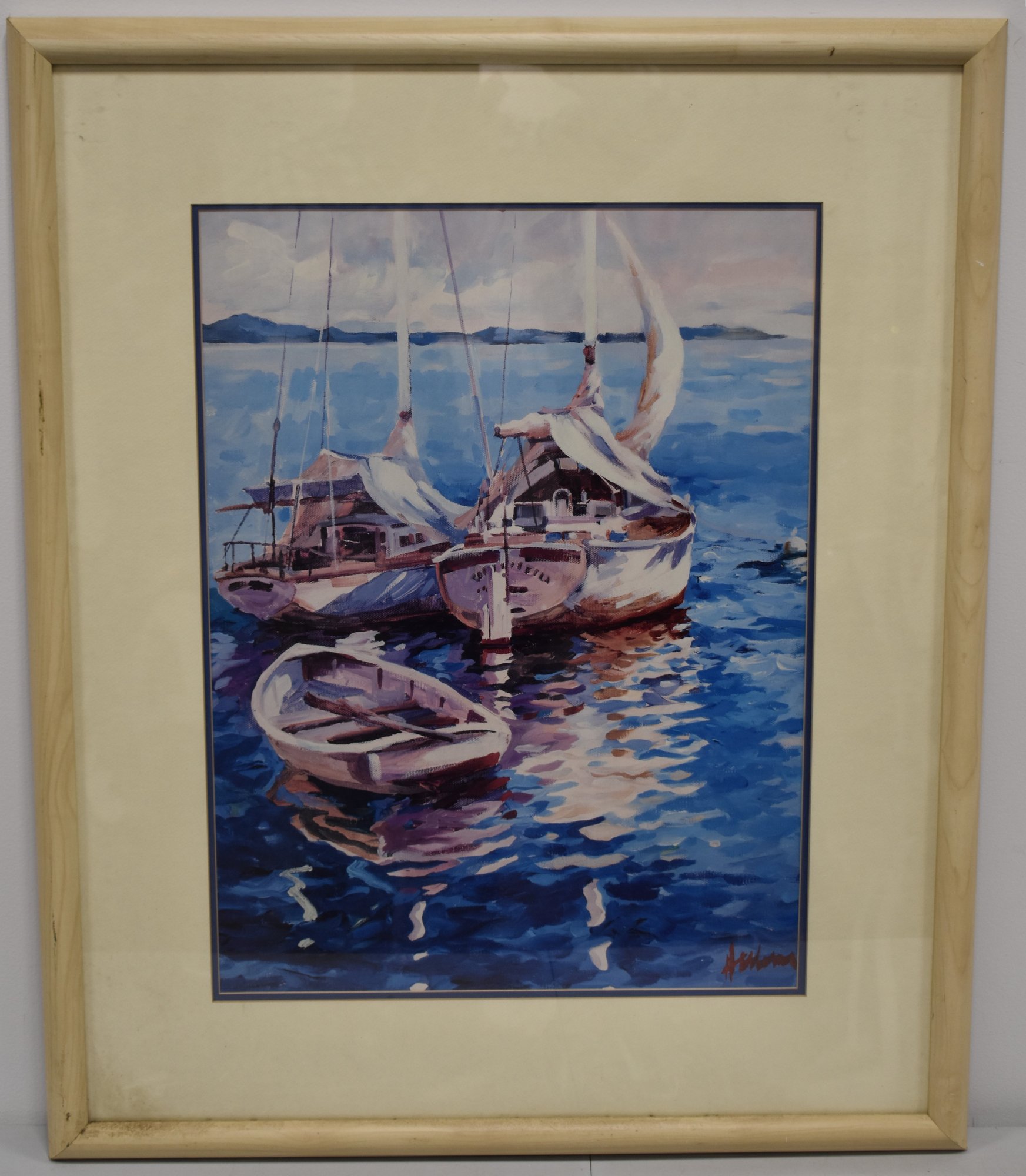 20TH CENT WATERCOLOR OF SAILING SHIPS W/ DINGY - 23 1/2" X 17 1/2" SIGHT - MATTED & FRAMED