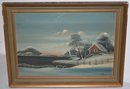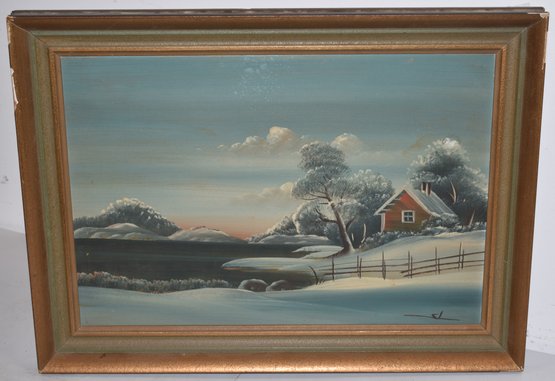OIL ON CANVAS WINTER SCENE W/ RED COTTAGE BY LAKE - SIGNED SL LOWER RIGHT - 13" X 19" SIGHT - FRAMED - WEAR