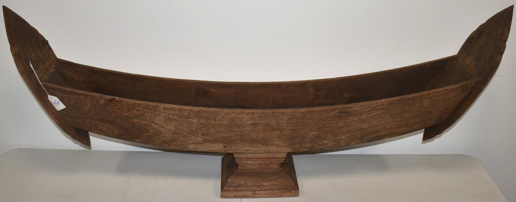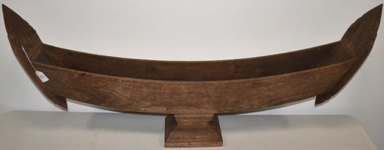 42 1/2" WOODEN BOAT FORM DISPLAY ON WOODEN PLINTH BASE - 17" T - WEAR & IMPERFECTIONS