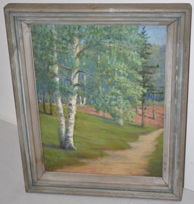 LATE 19TH EARLY 20TH CENT OIL PAITNING ON ACADEMY BOASRD OF WOODLAND LANDSCAPE W/ BIRCH TREE - UNSIGNED - 14 1/2" X 11" - IMPERFECTIONS