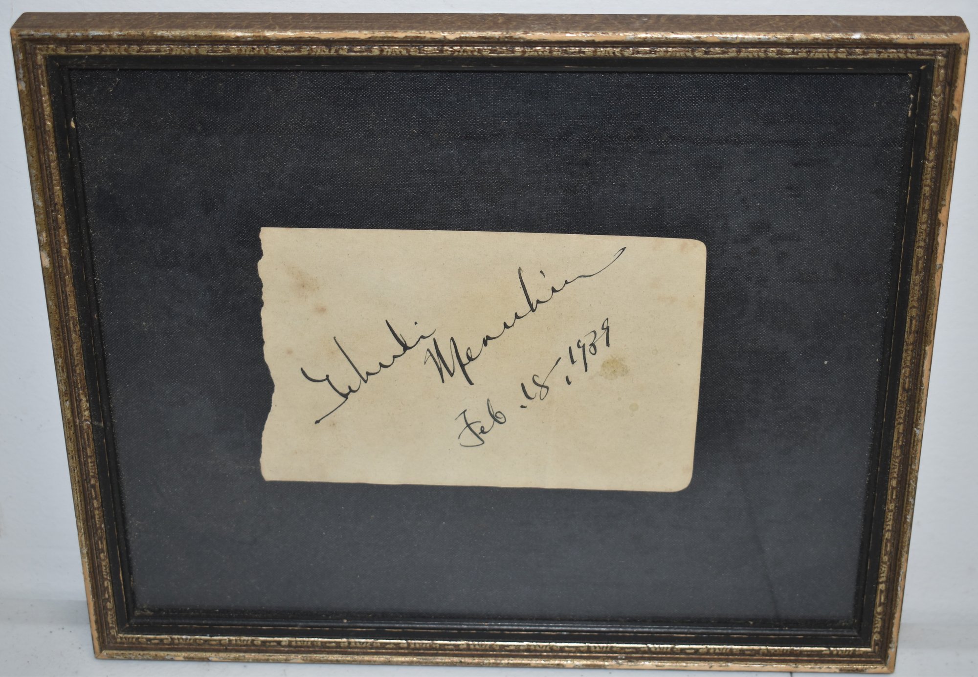 FRAMED 3 1/4" X 5" - PIECE OF PAPER W/ YHEUDI MENUHIN AUTOGRAPH - FEB 18 1939 - TONING