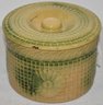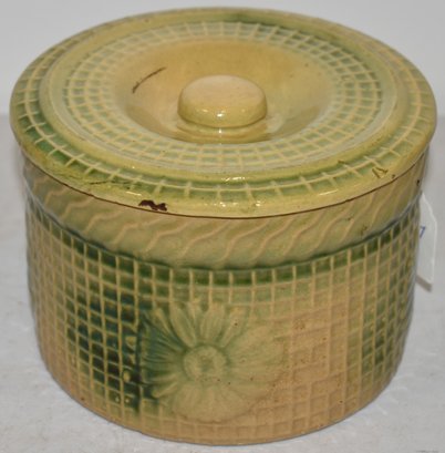 YELLOWARE BUTTER CROCK W/ LID W/ EMBOSSED DAISY & WAFFLE PATTERN - 6 3/4" D X 4 1/2" T - WEAR