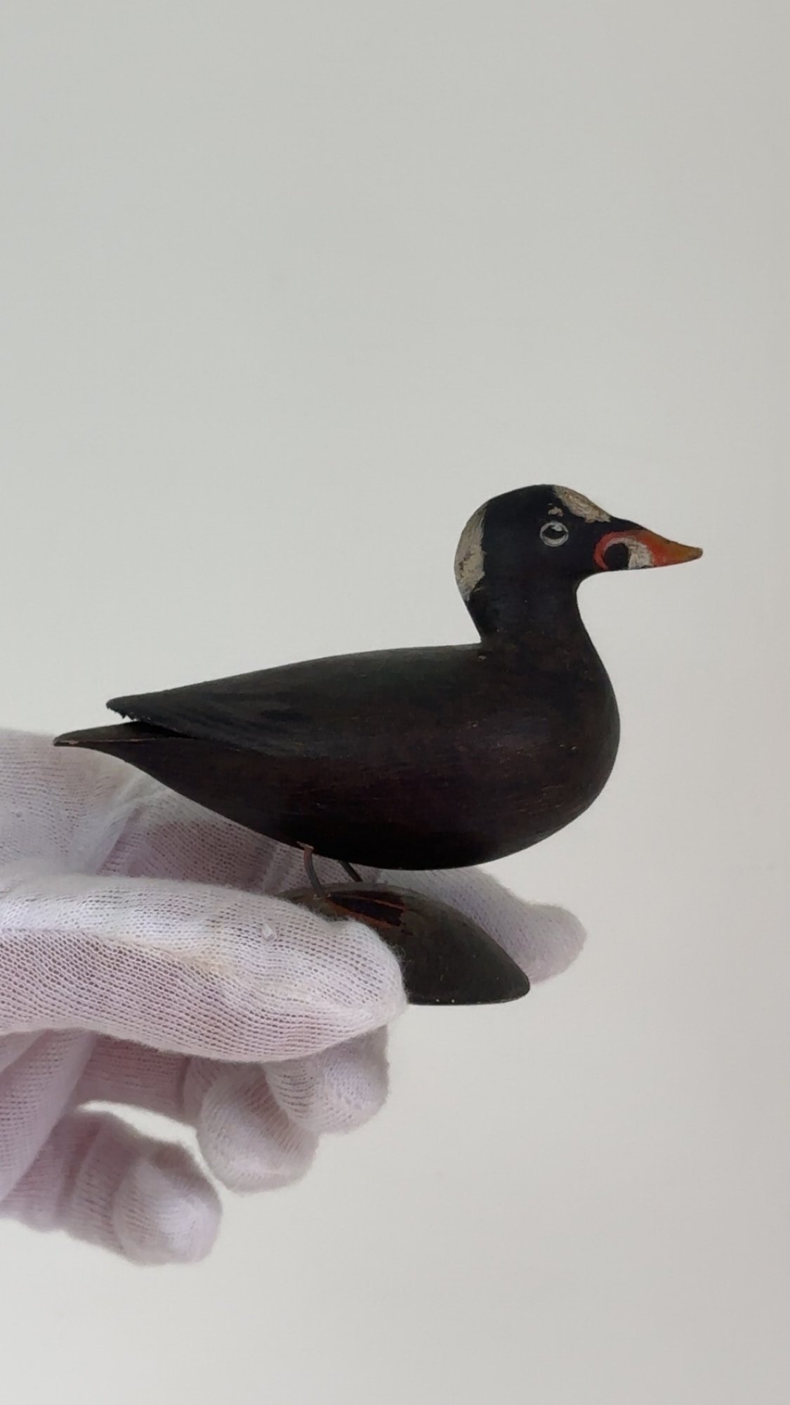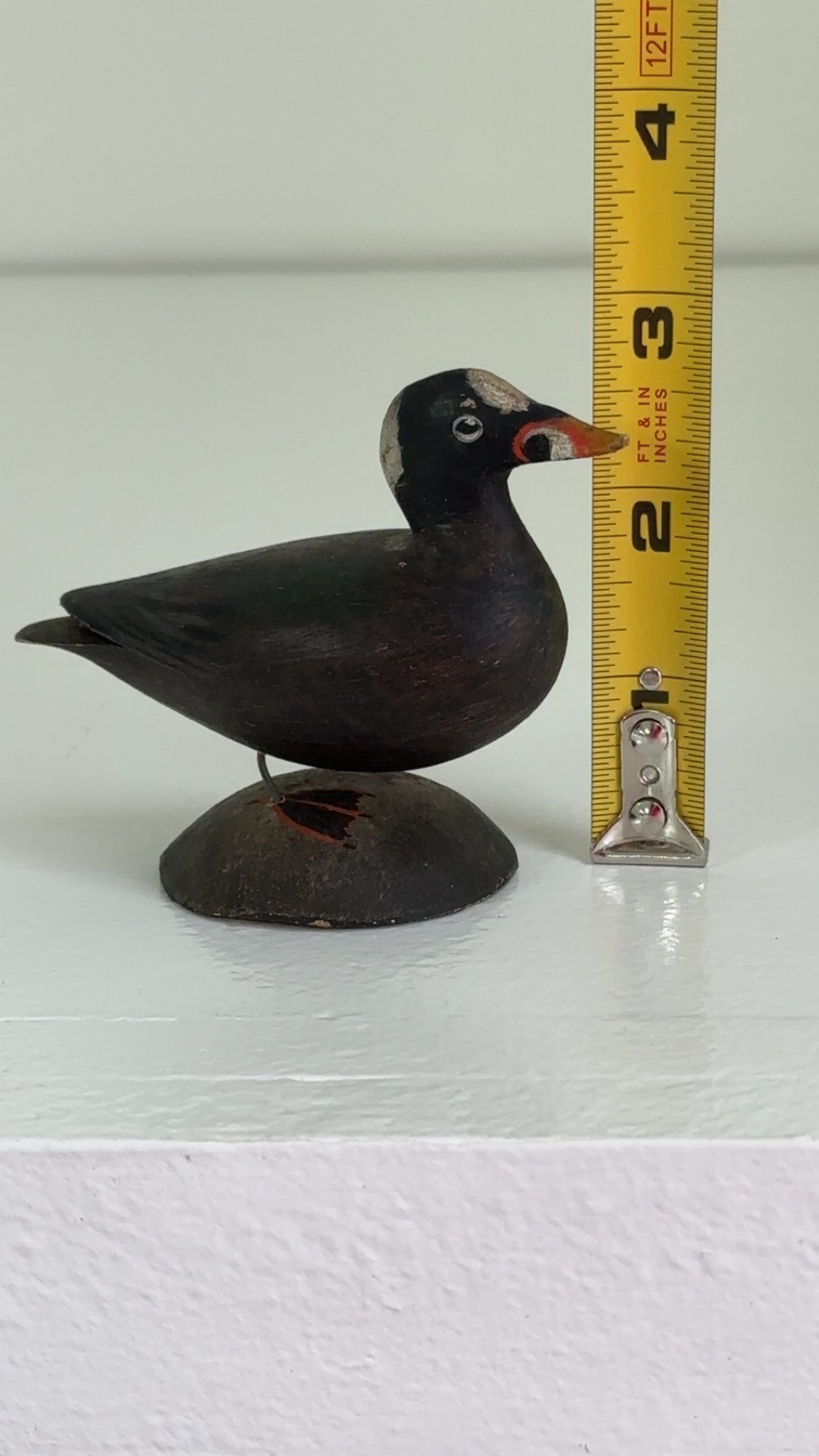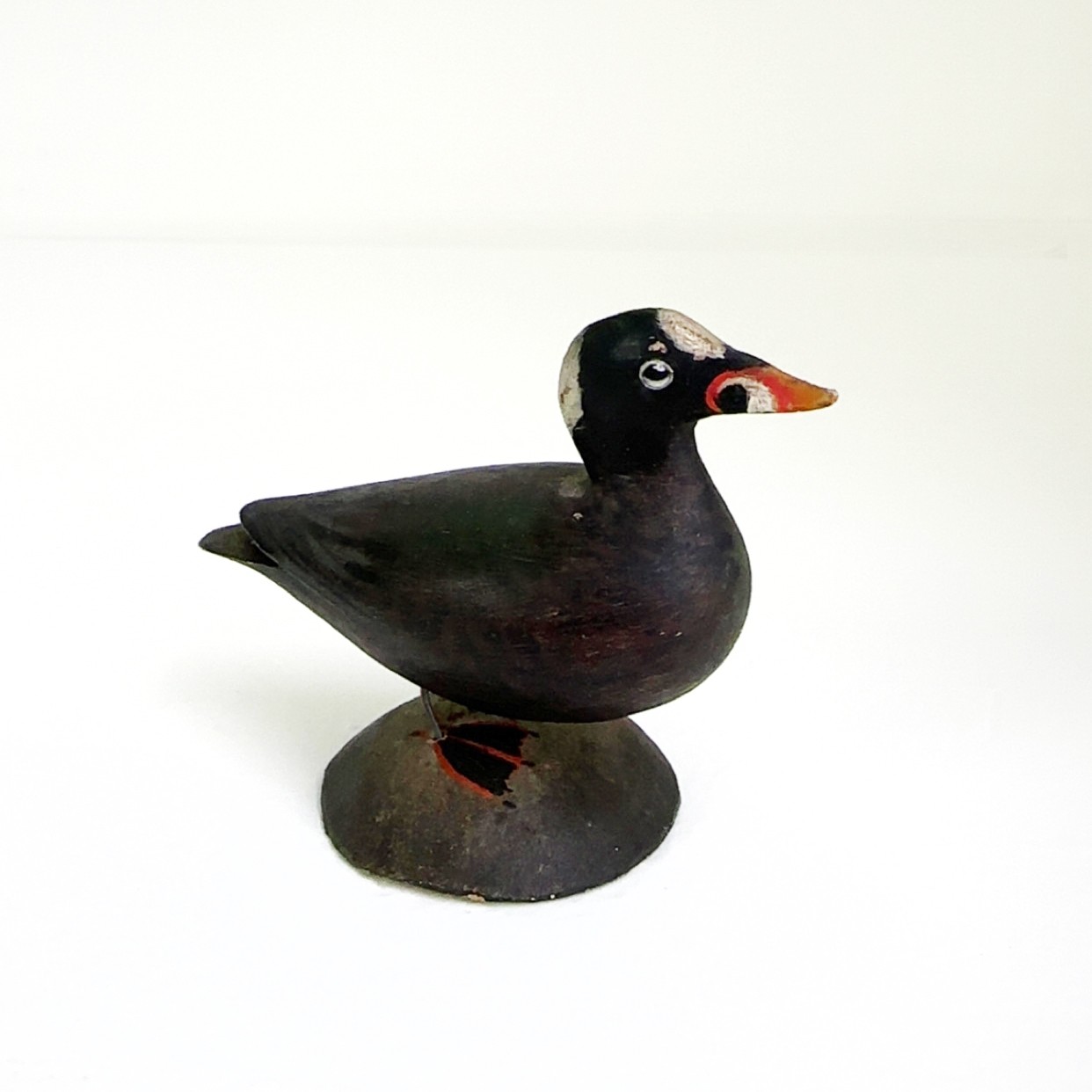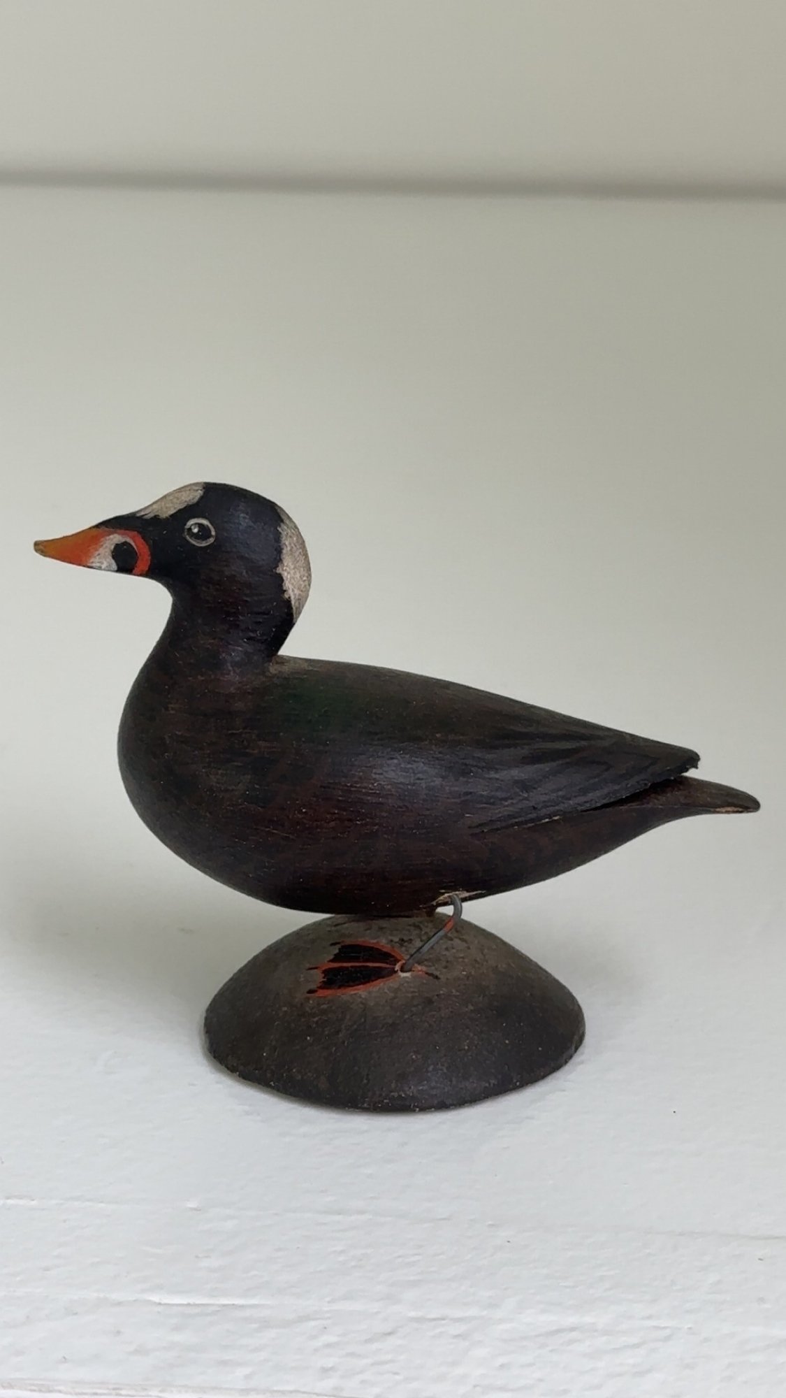 Notes: The surf scoter bird is in great condition. There is some paint loss to back leg, and it is slightly lose. The blue paper label is half missing on the bottom.