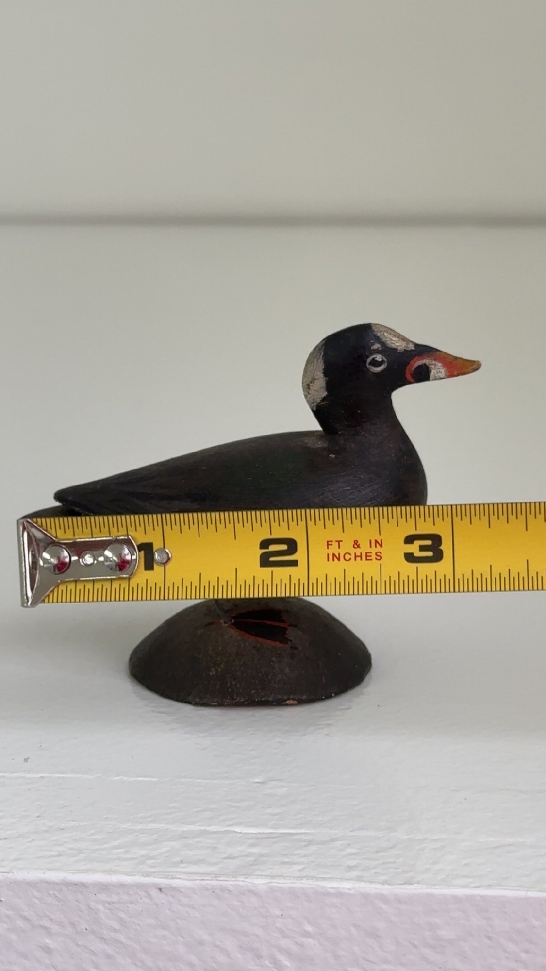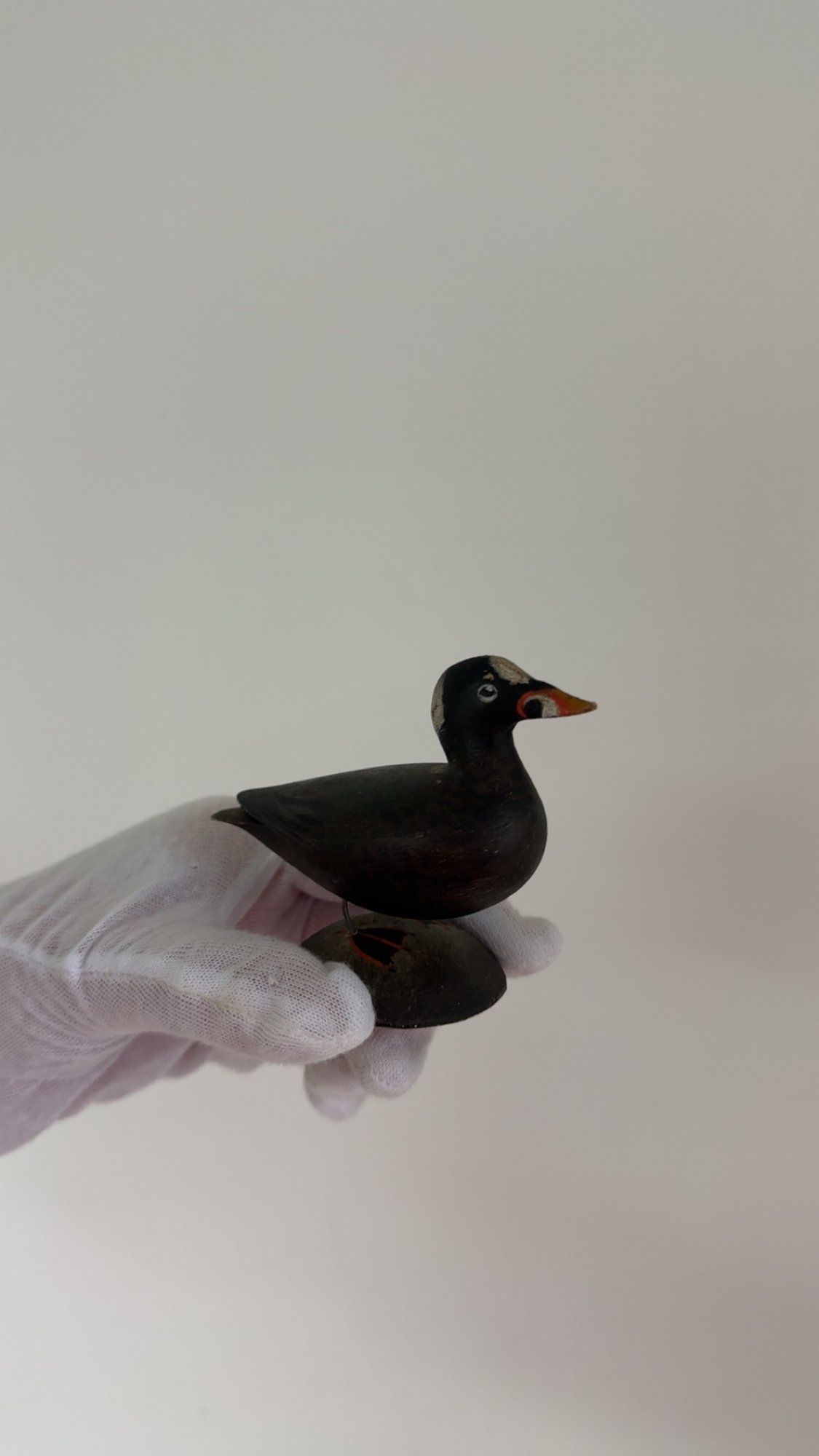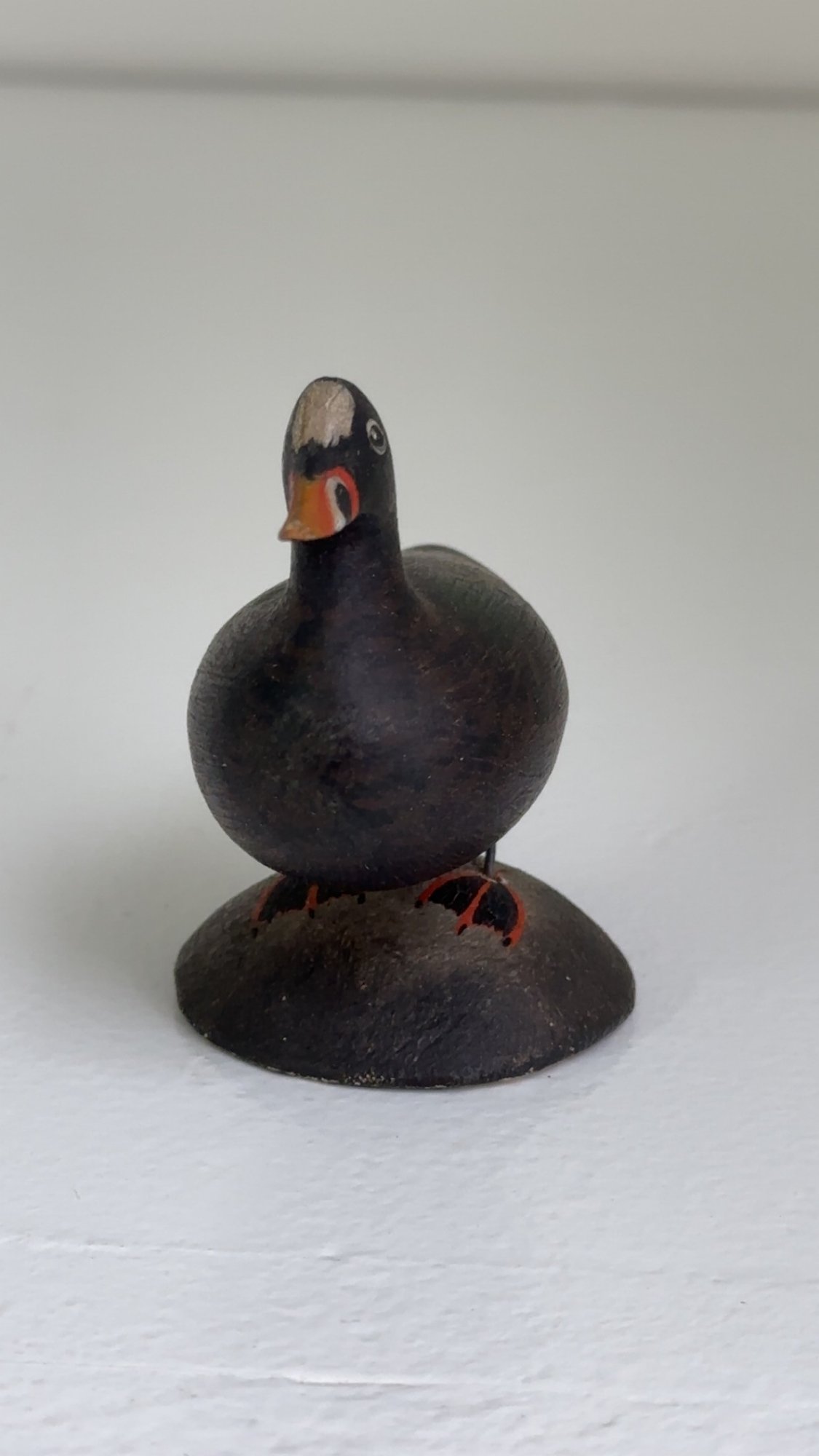 Notes: The surf scoter bird is in great condition. There is some paint loss to back leg, and it is slightly lose. The blue paper label is half missing on the bottom.