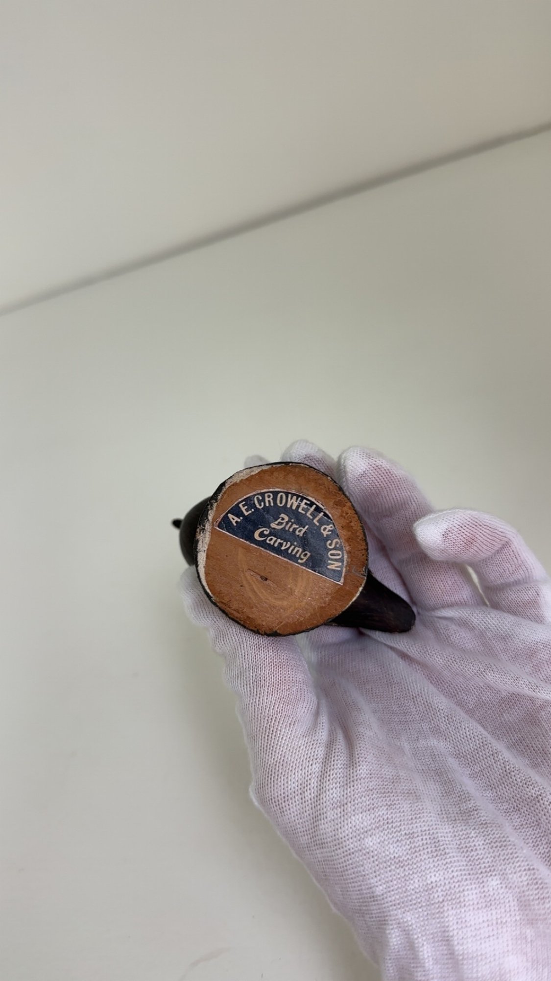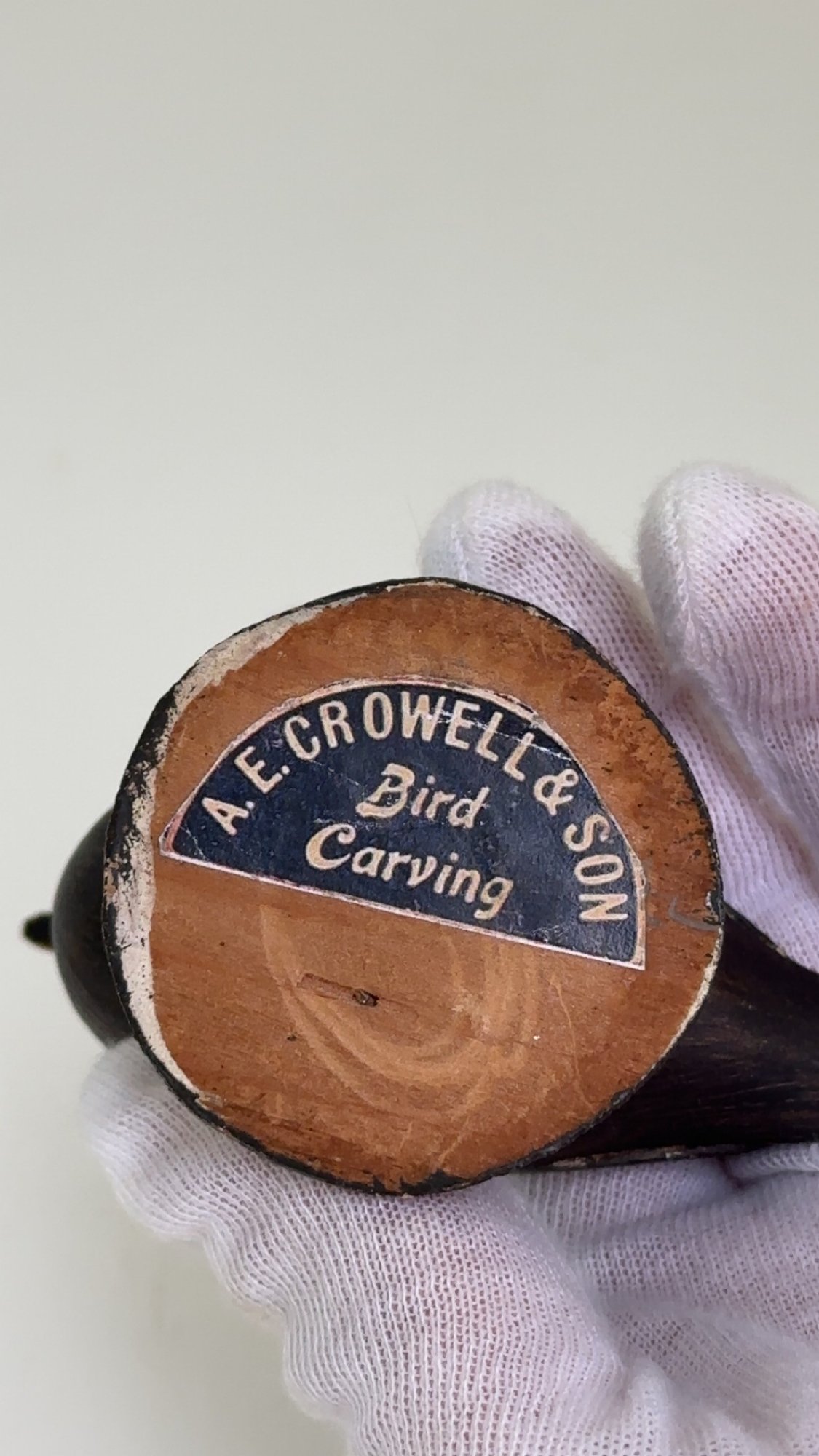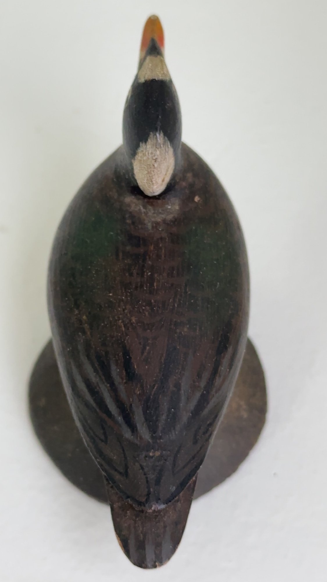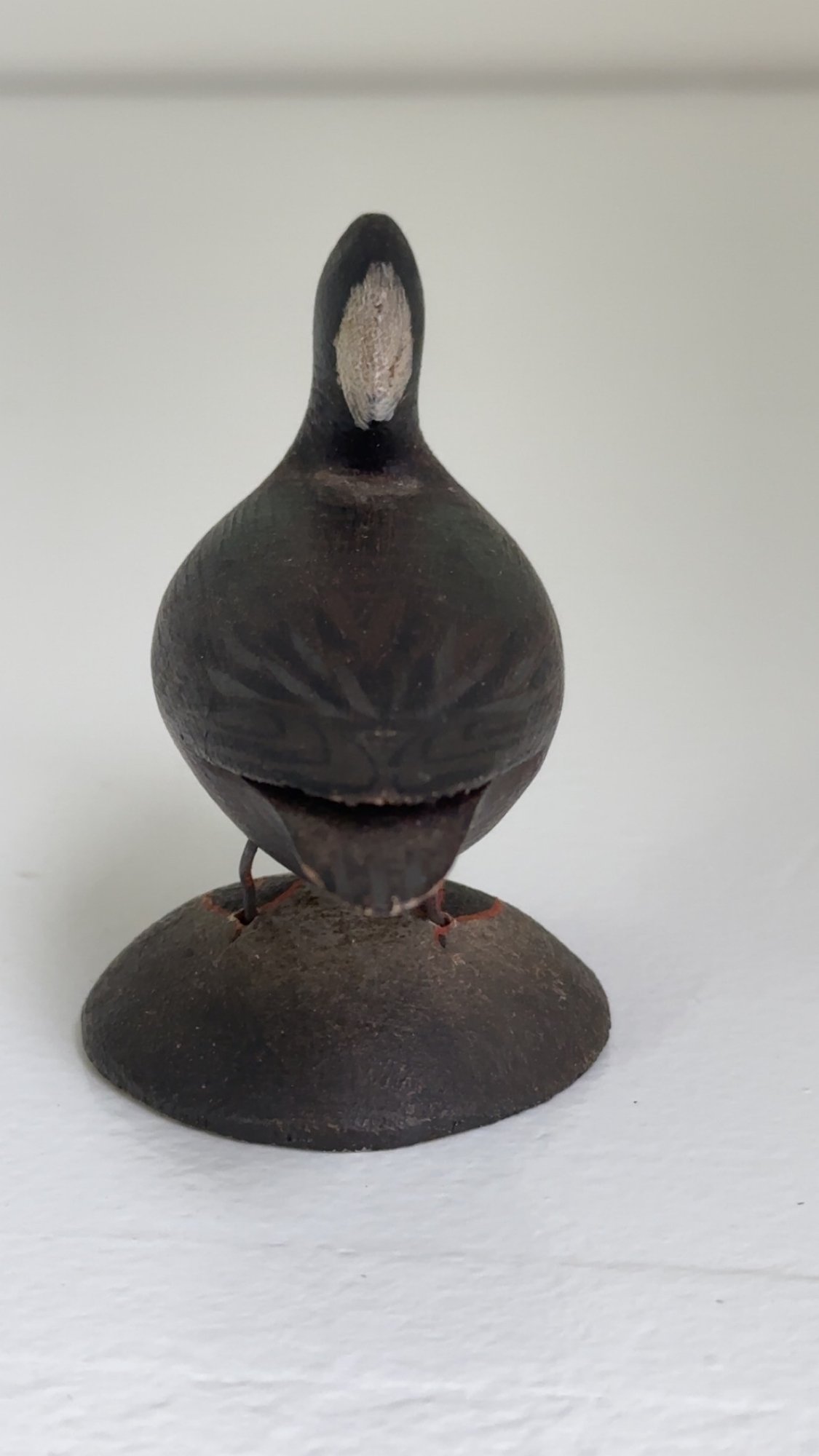 Notes: The surf scoter bird is in great condition. There is some paint loss to back leg, and it is slightly lose. The blue paper label is half missing on the bottom.