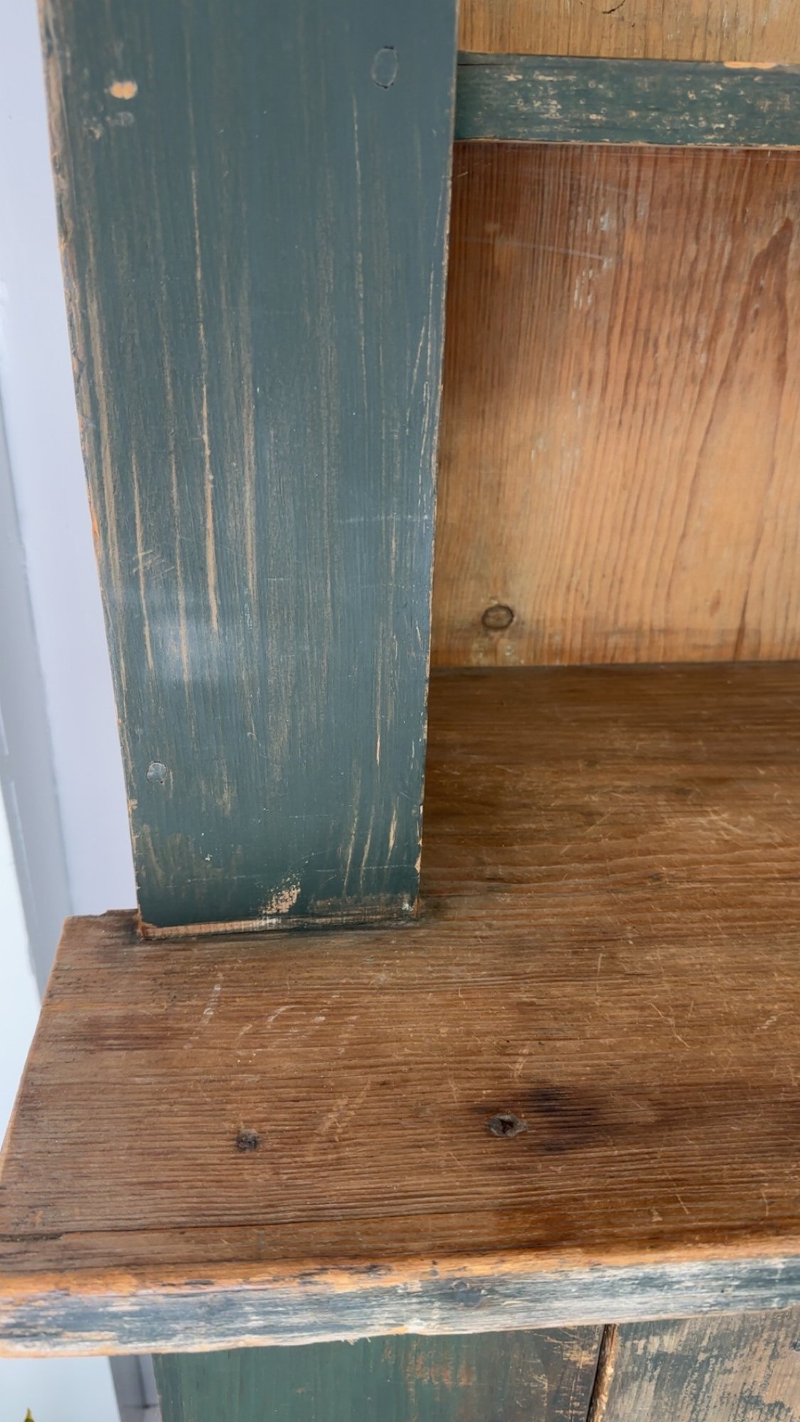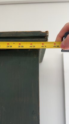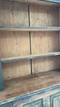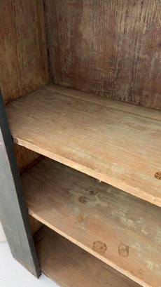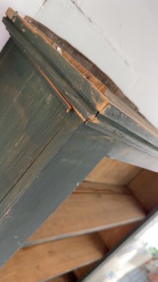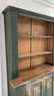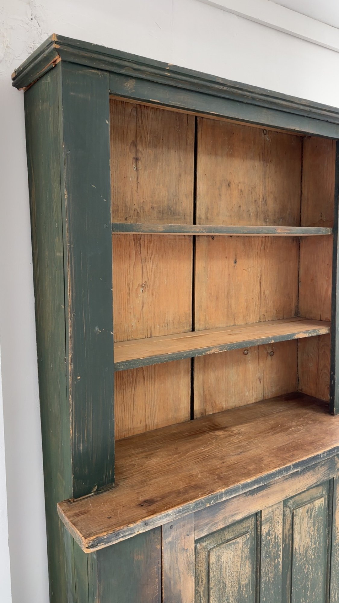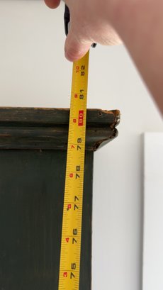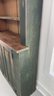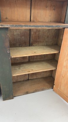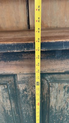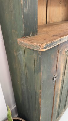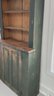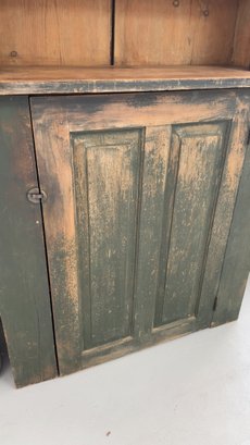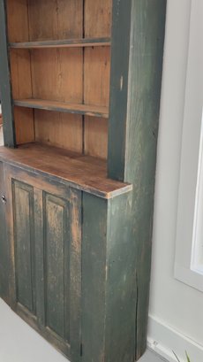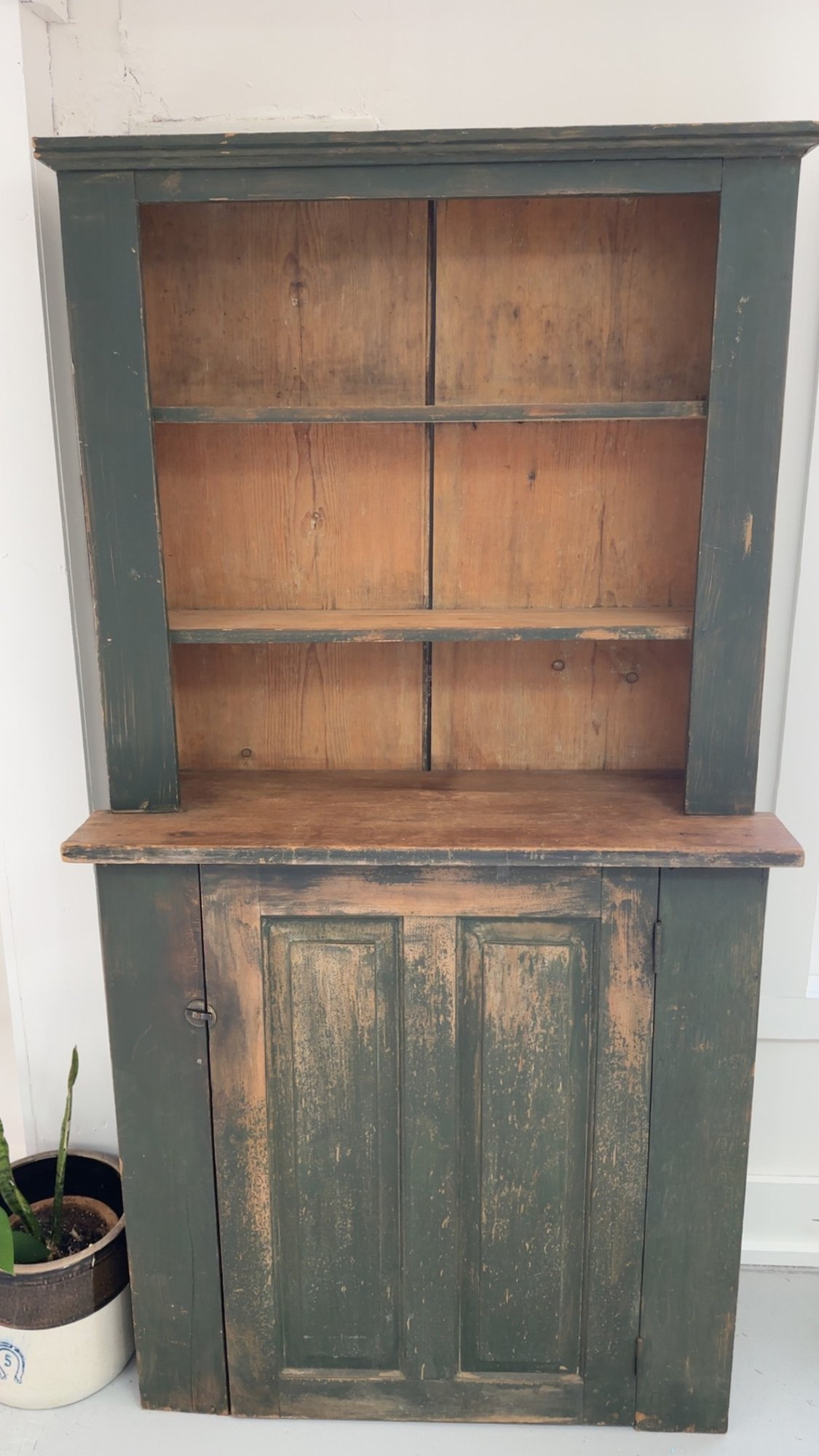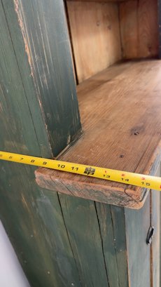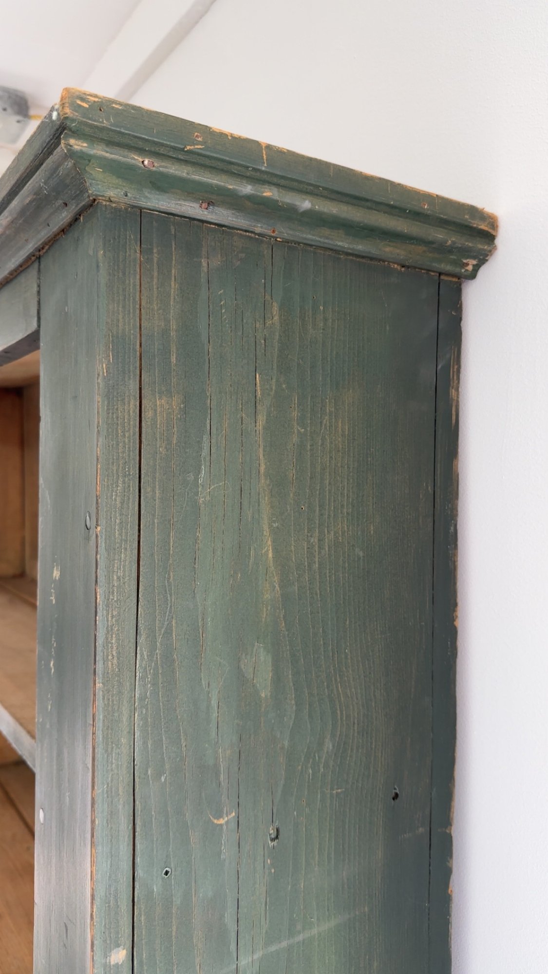 Raised paneling on door, three shelves up top for storage/display and crown molding at the top. Nice old green paint with amazing patina. Clean on inside, too! One of the best features about this cupboard, is that it is only 15" deep! Will fit in most places, and offer incredible storage!