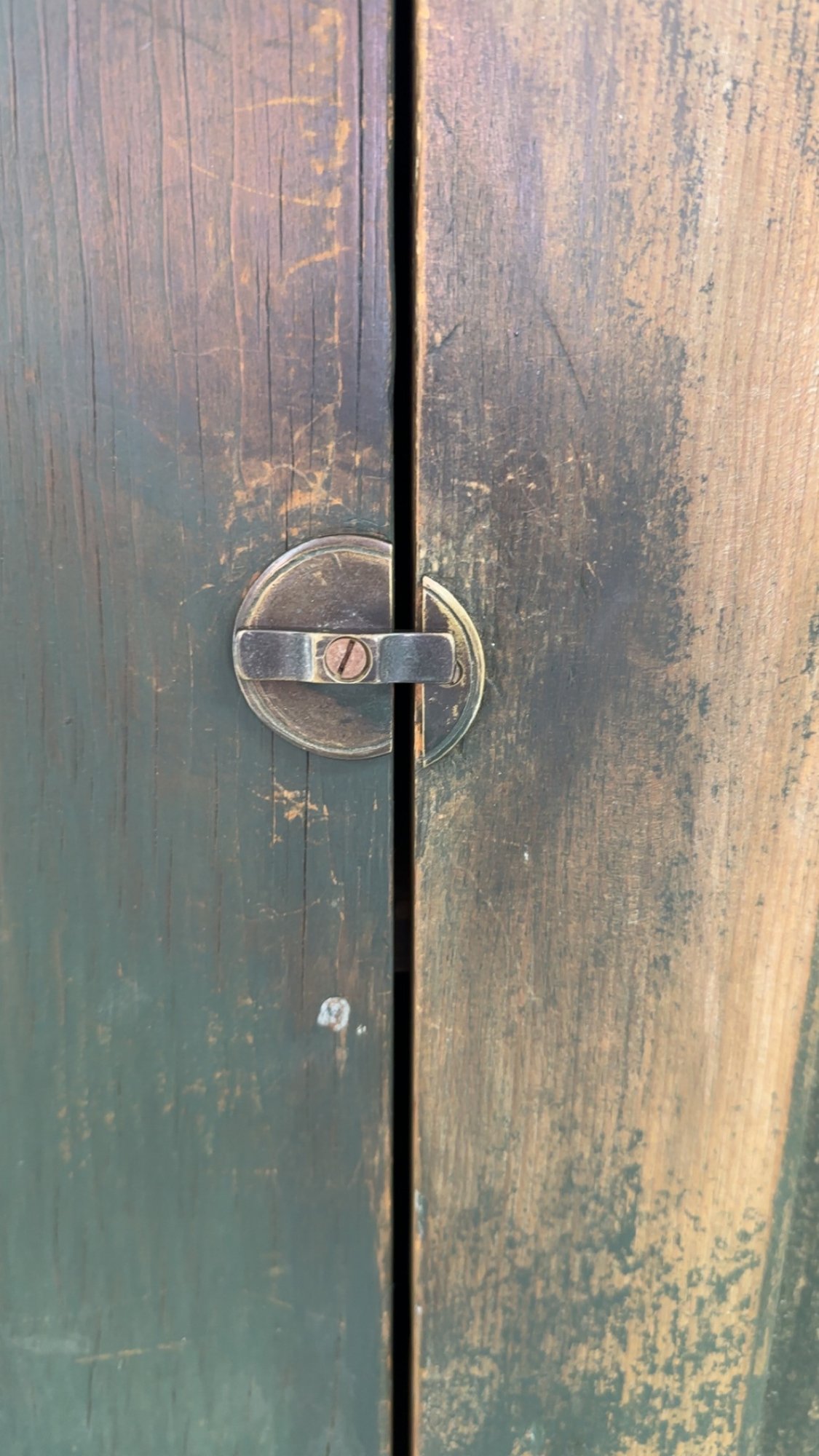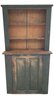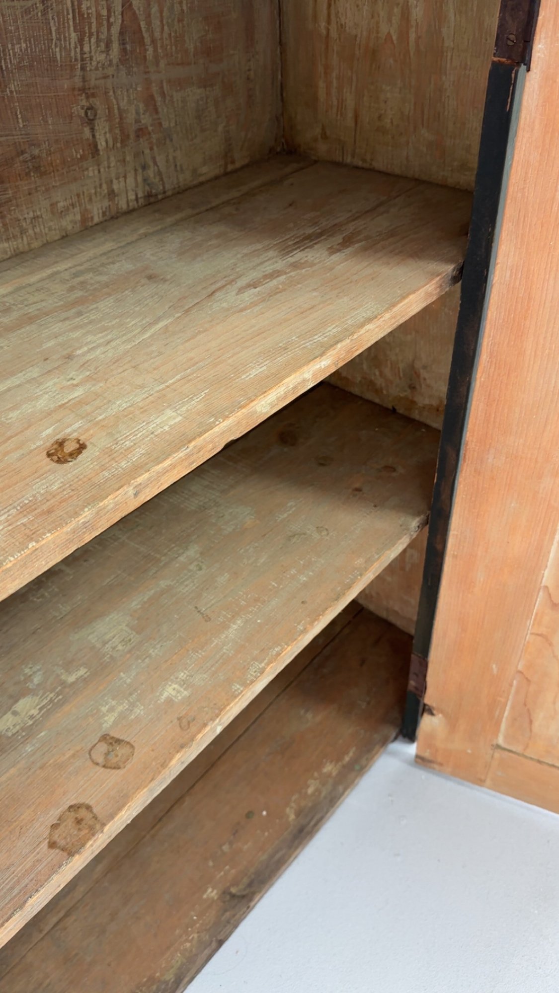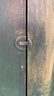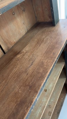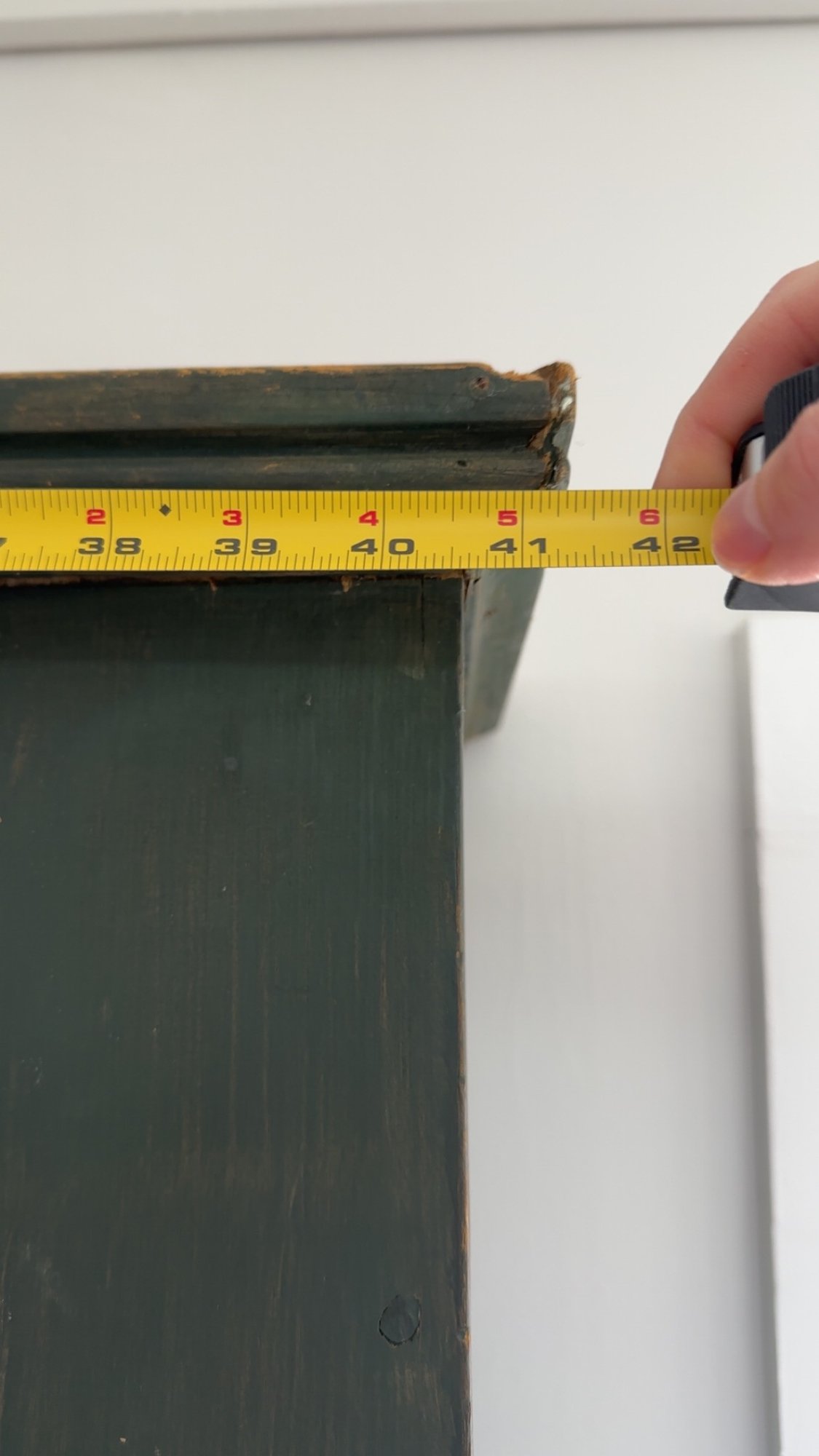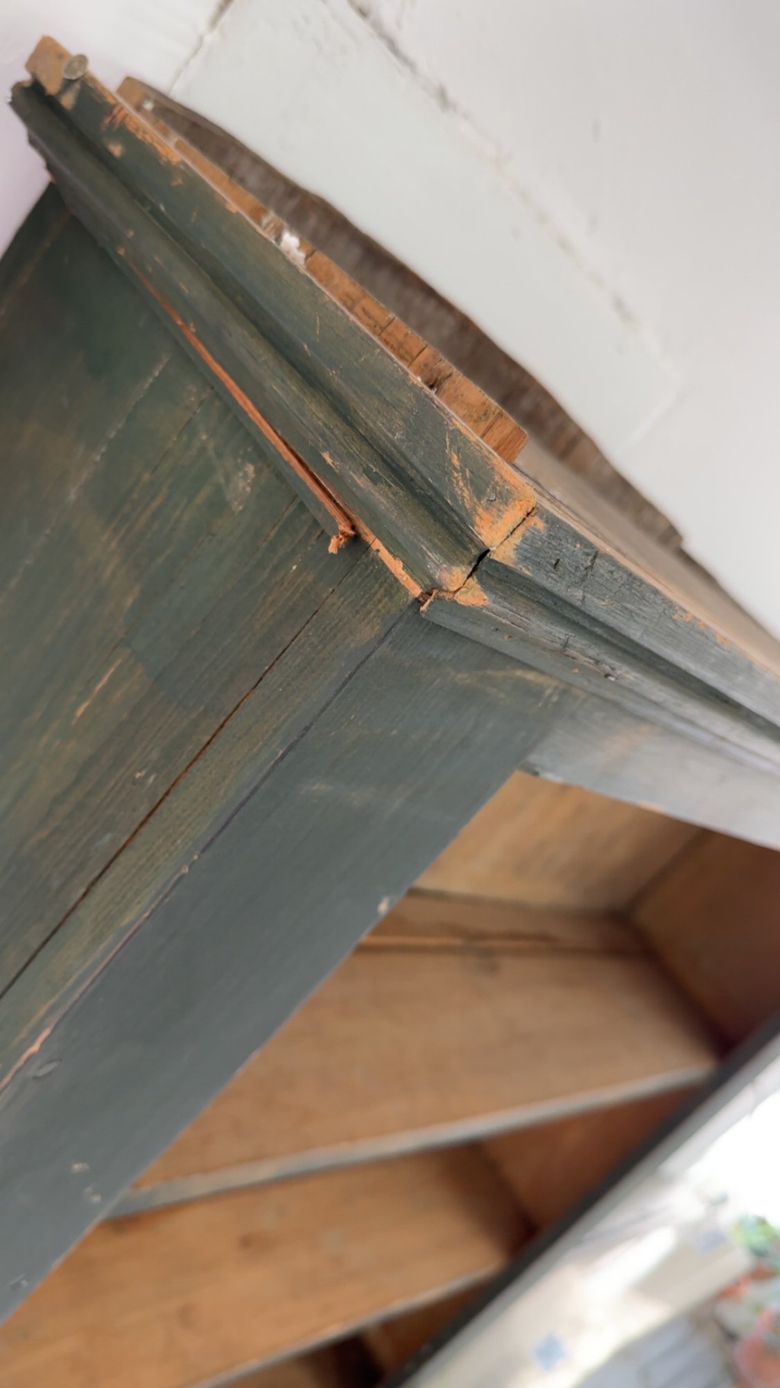 Raised paneling on door, three shelves up top for storage/display and crown molding at the top. Nice old green paint with amazing patina. Clean on inside, too! One of the best features about this cupboard, is that it is only 15" deep! Will fit in most places, and offer incredible storage!