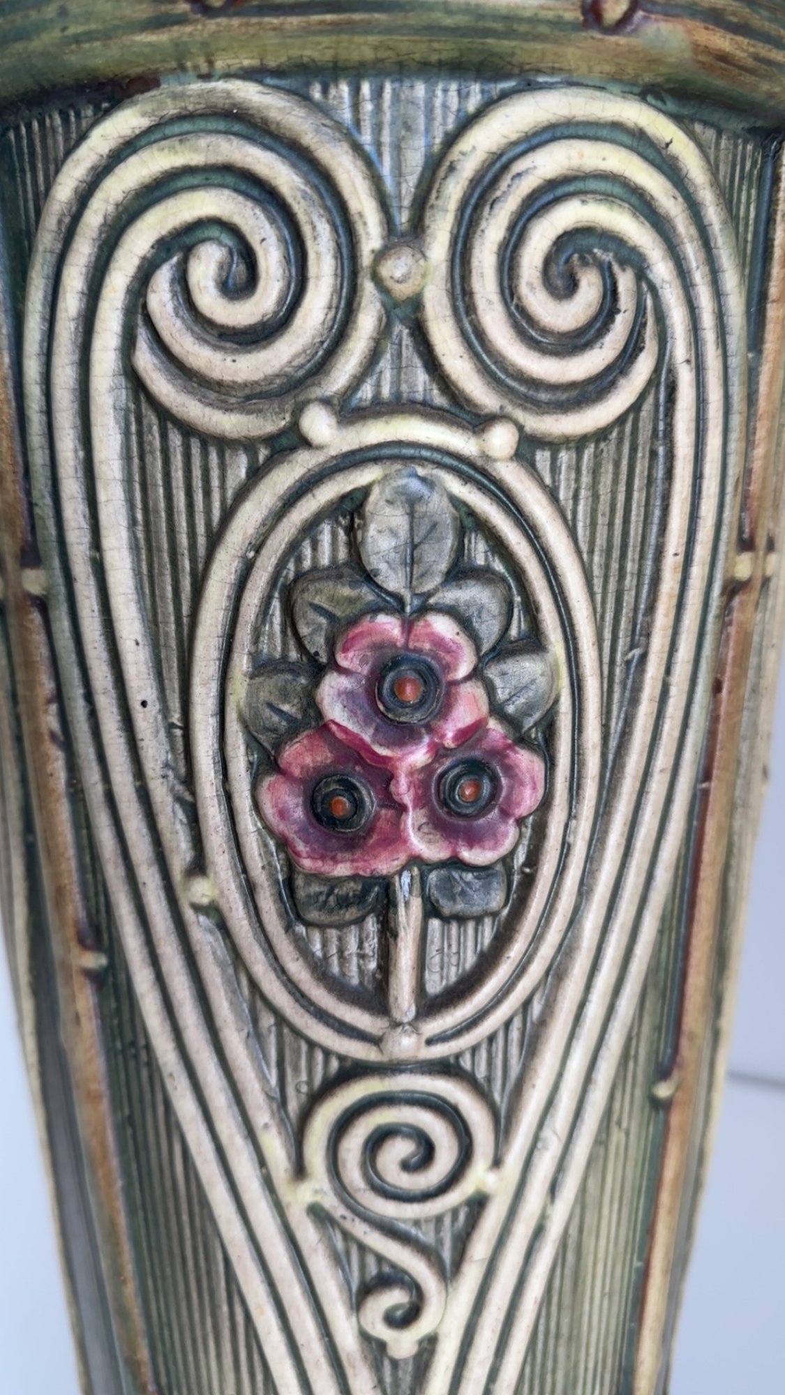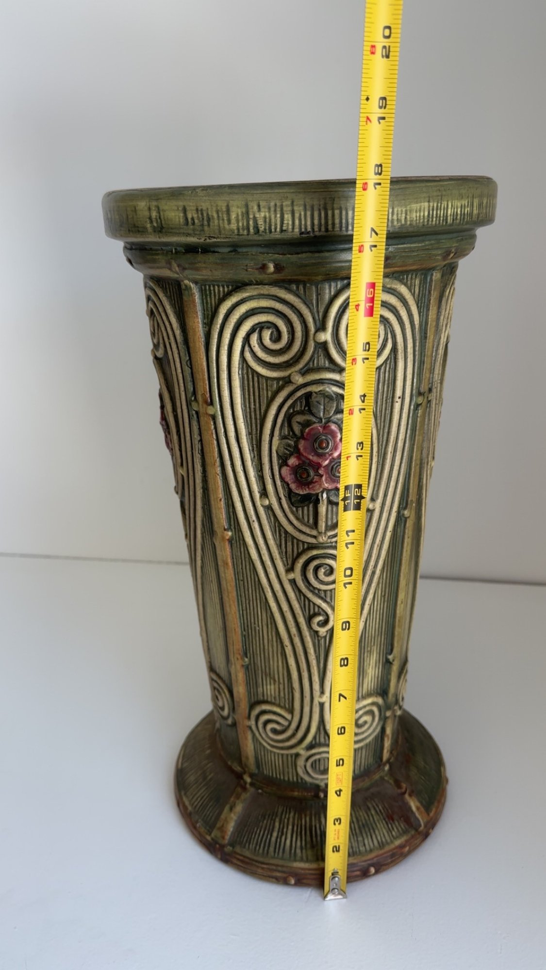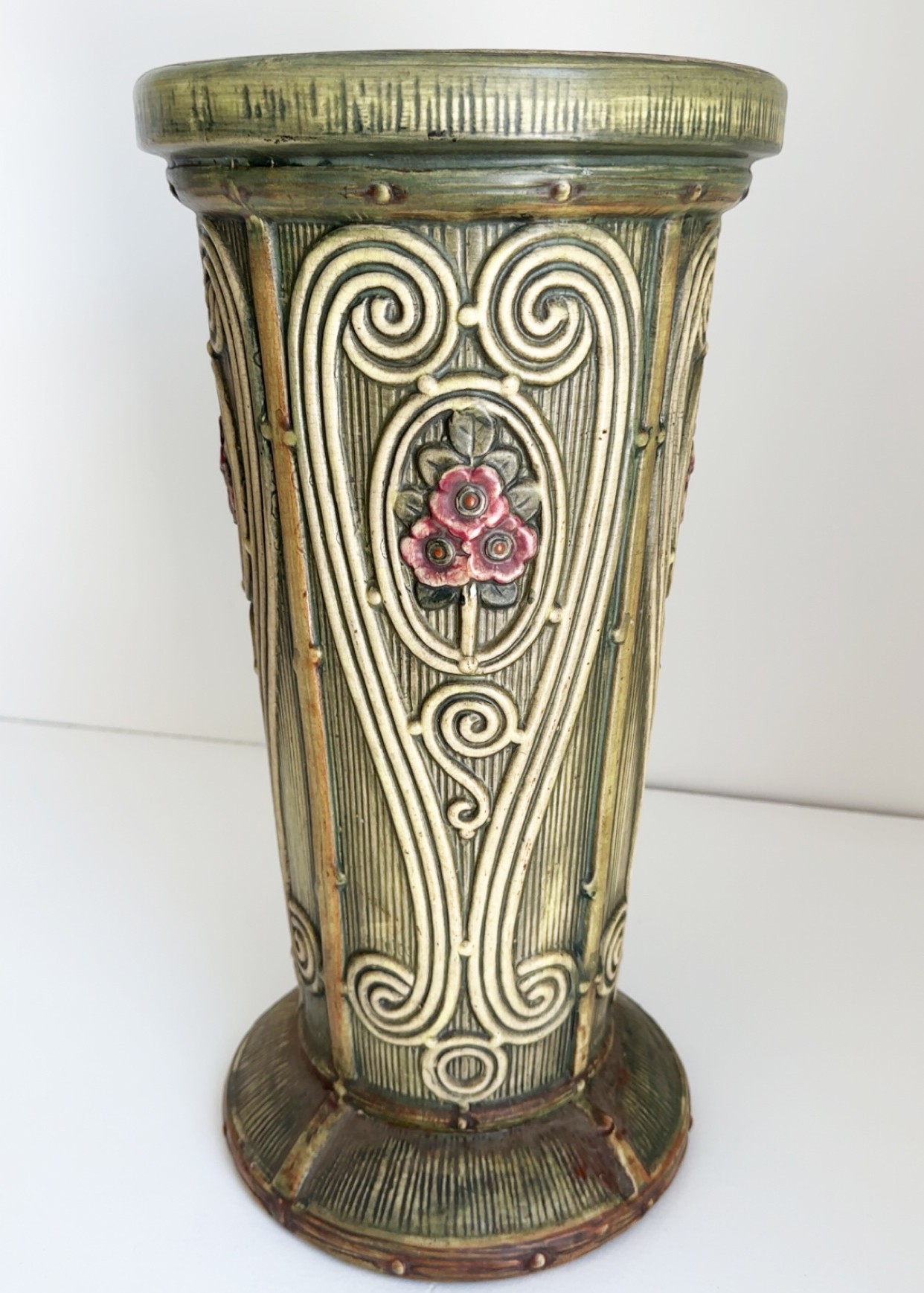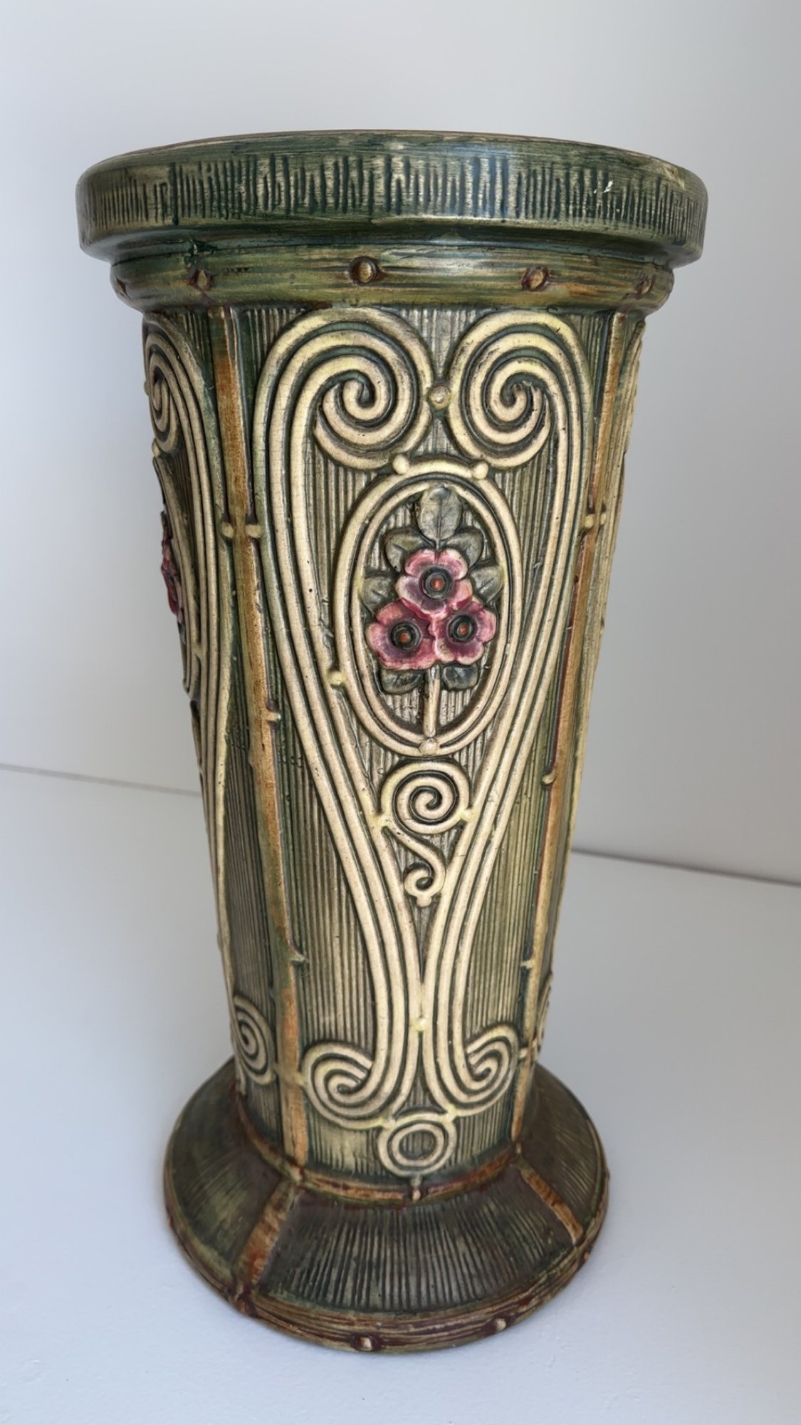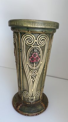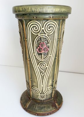 Nice decor piece in the style of Weller pottery. This piece is not signed.