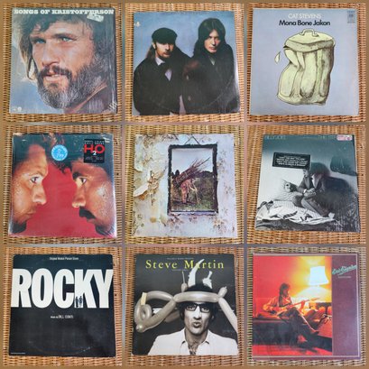 This curated lot contains nine vintage vinyl record albums featuring essential titles from Led Zeppelin, Billy Joel, and Eric Clapton. These classic 33 RPM LPs represent a cross-section of 1970s and 1980s music history across the rock, folk, and soundtrack genres.