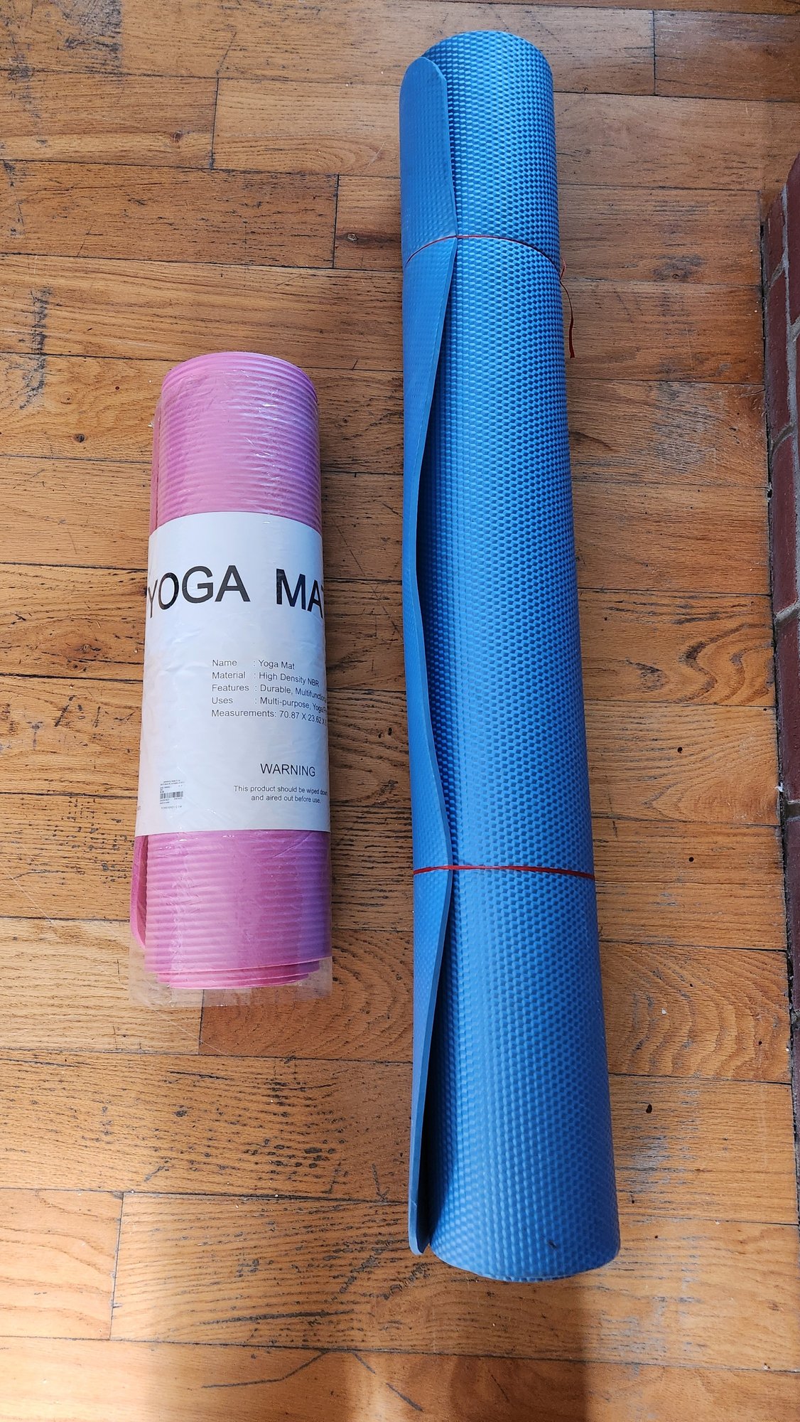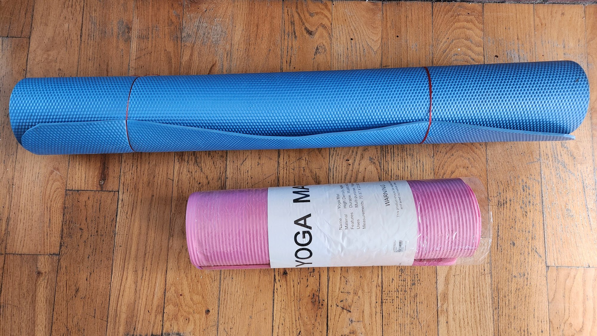 This listing is for a lot of two exercise mats. The first is a pink Forever 21 yoga mat, new in original plastic packaging. It is made of high-density NBR foam and measures approximately 70.87" x 23.62". The second is a blue textured fitness mat measuring 47" in length. Both items are suitable for yoga, Pilates, or general floor exercises. Comes as shown, sold as is.