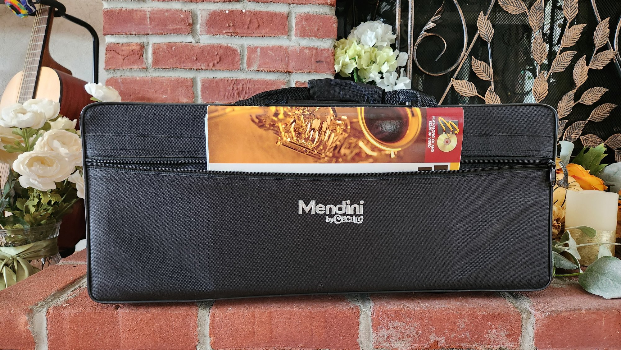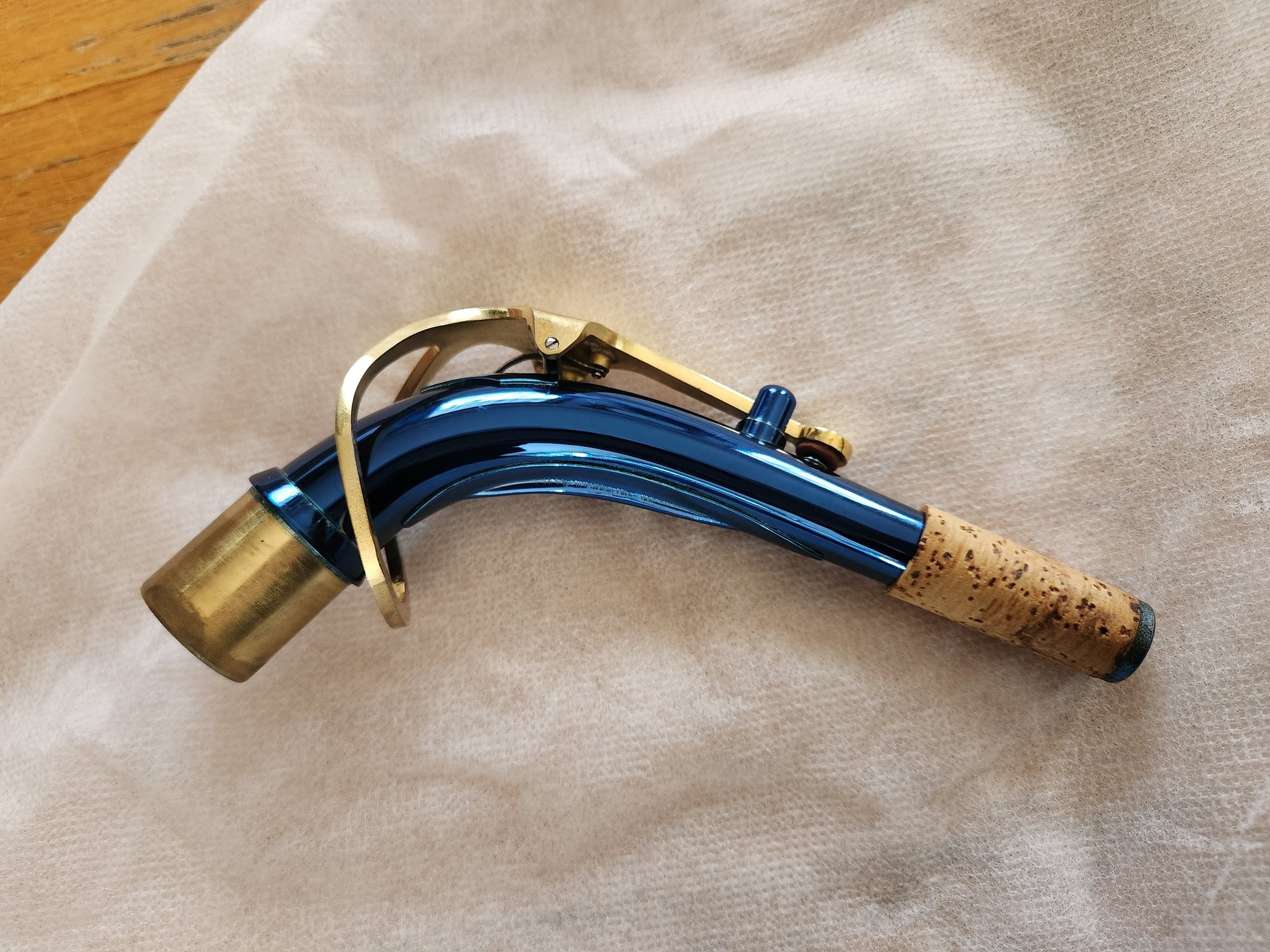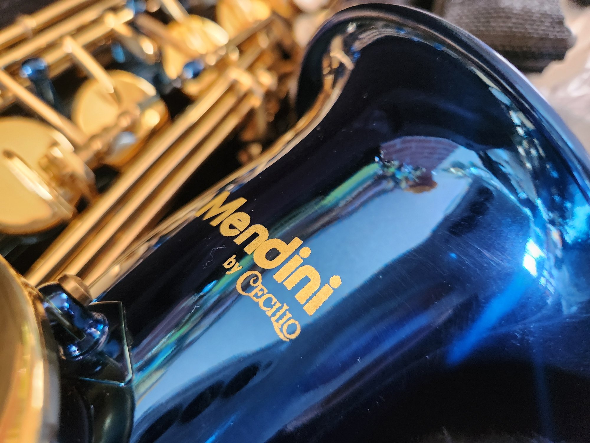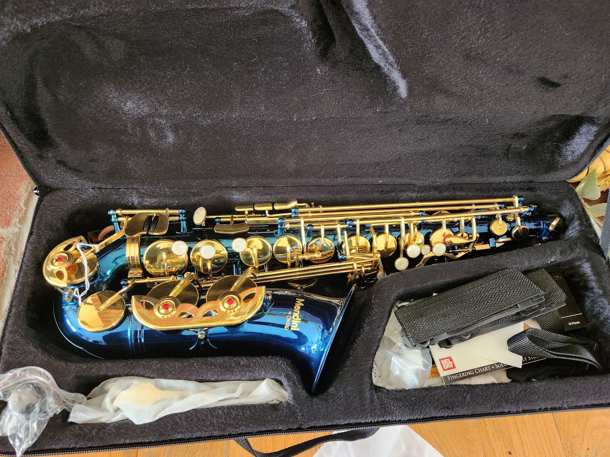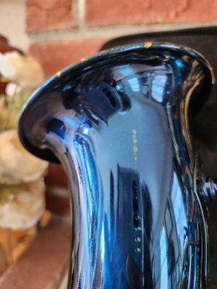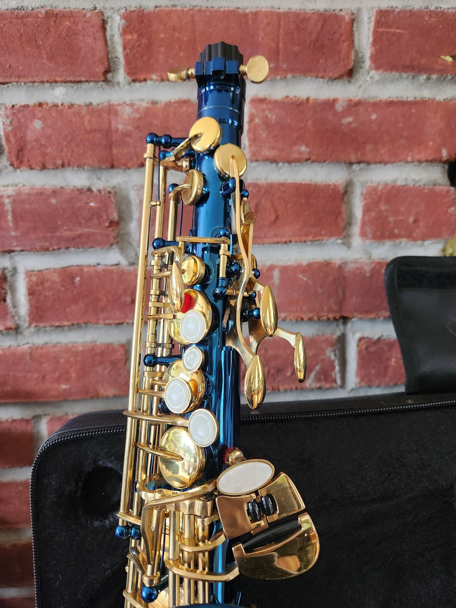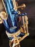 This E-flat alto saxophone features a vibrant metallic blue lacquer finish with gold-accented keys and includes the original hard-shell case. The instrument comes as a complete student outfit with the mouthpiece, neck strap, and protective storage.