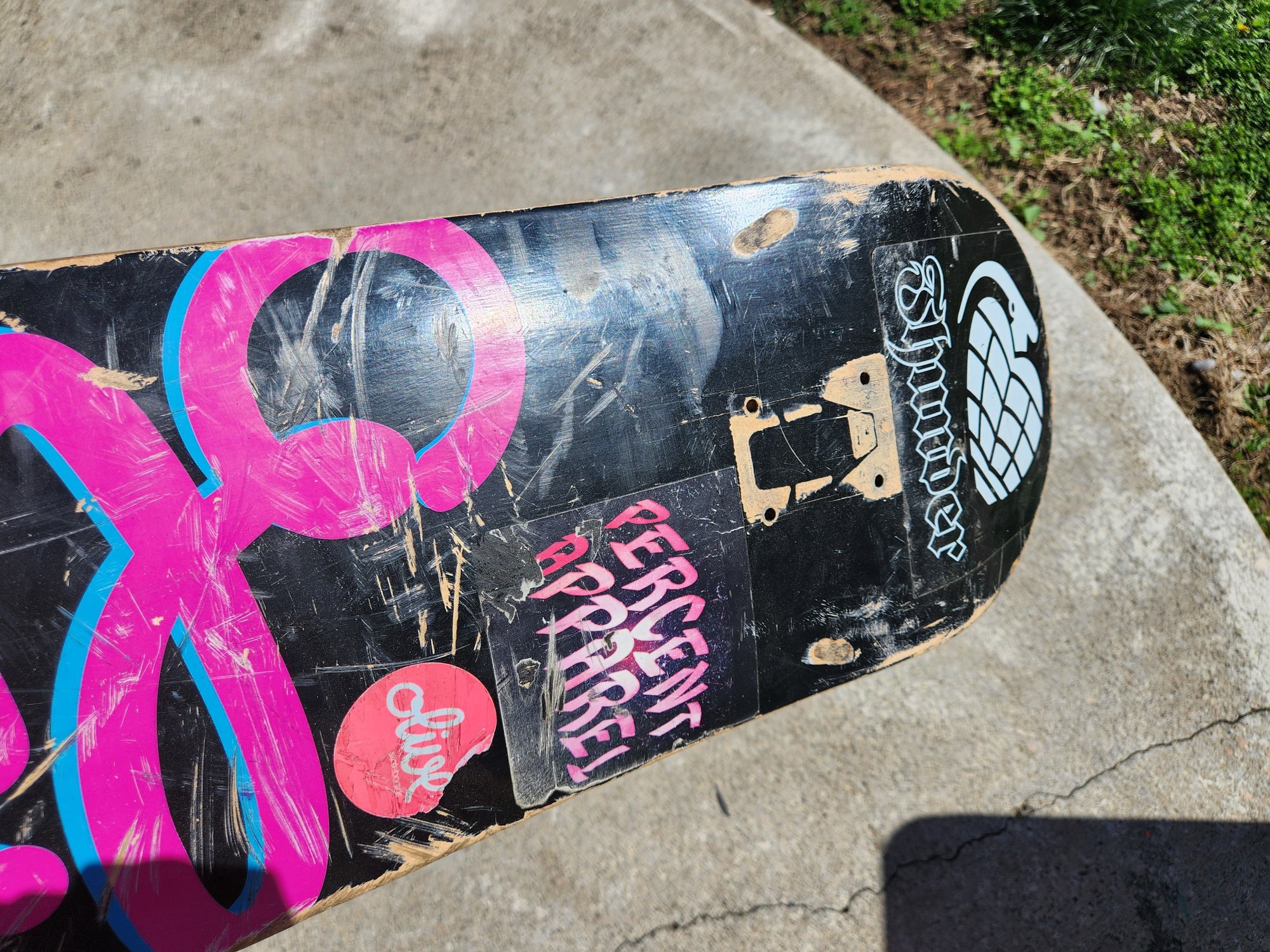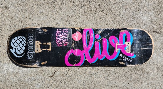 This professional-grade Olive Skateboard Co. deck features a durable 7-ply maple construction and the brand's classic script logo in a bold pink and blue colorway. A great choice for a custom build or as a replacement deck, it comes equipped with authentic Thunder and Percent Apparel decals.